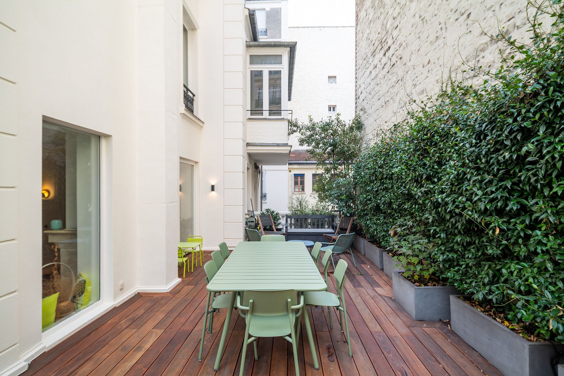 Envision the luxury of a Parisian apartment renovated to the highest standards, complemented by a sun-drenched terrace upstairs and a lush garden on the ground floor.