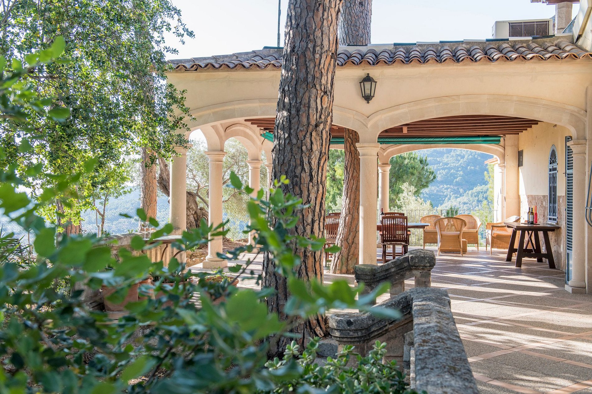 The outdoor area features rural and very private gardens and a pool with panoramic views. Outside the perimeter of the house, the guests can fully enjoy the lush green slopes of the Tramuntana Mountains.