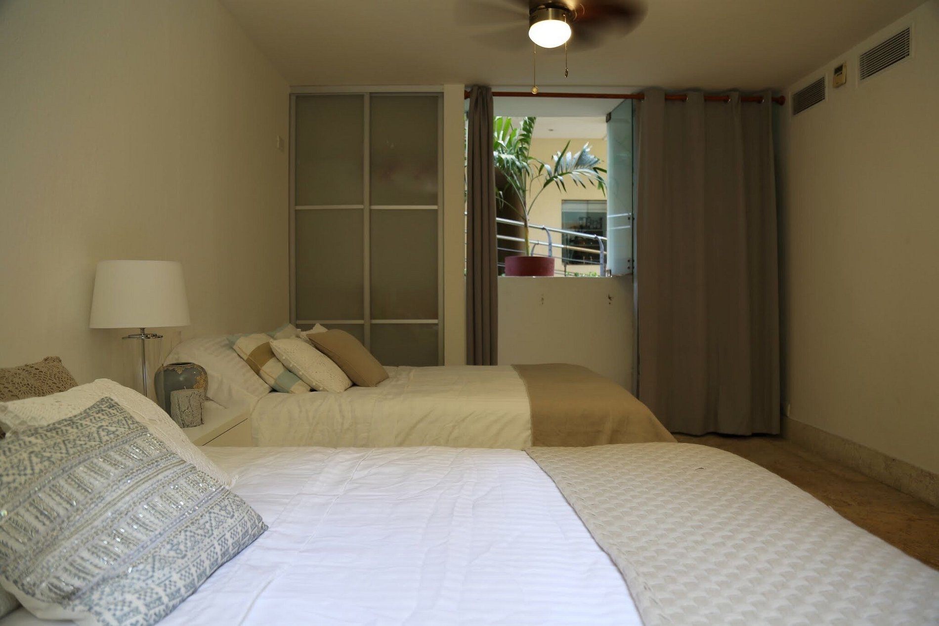 • The second bedroom features two full-size beds and an ensuite with a modern shower.