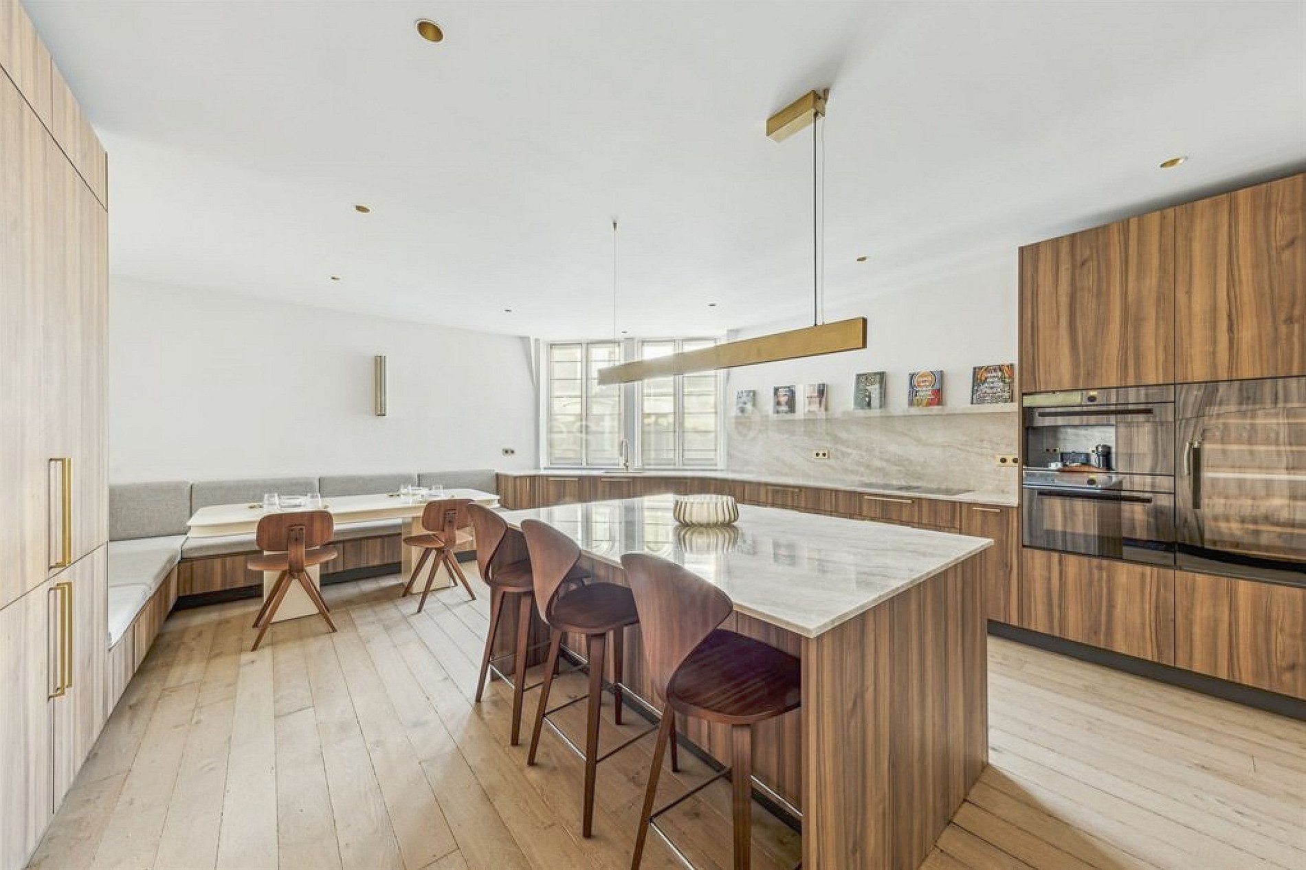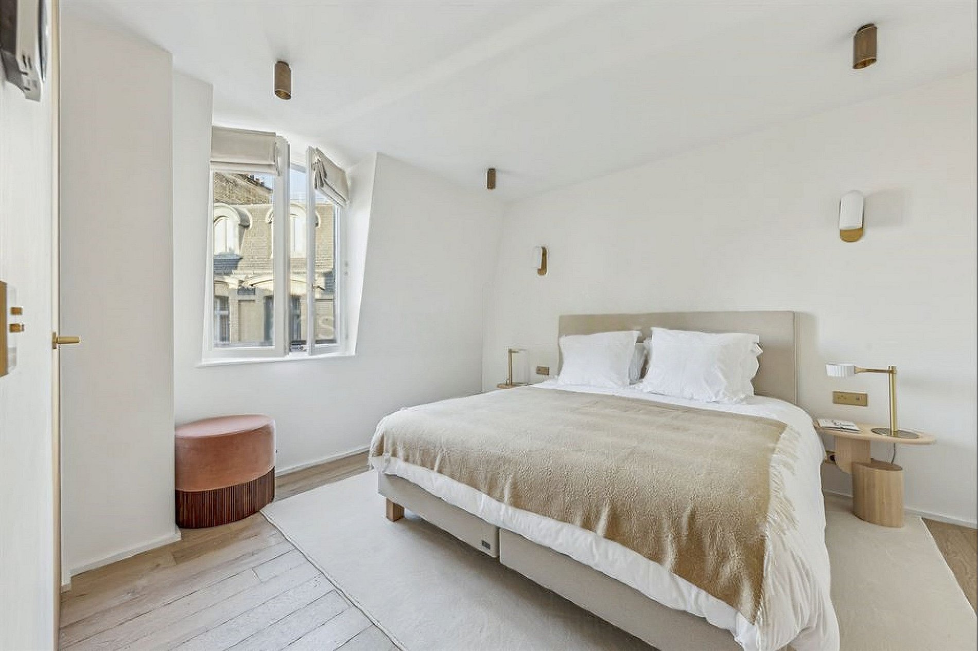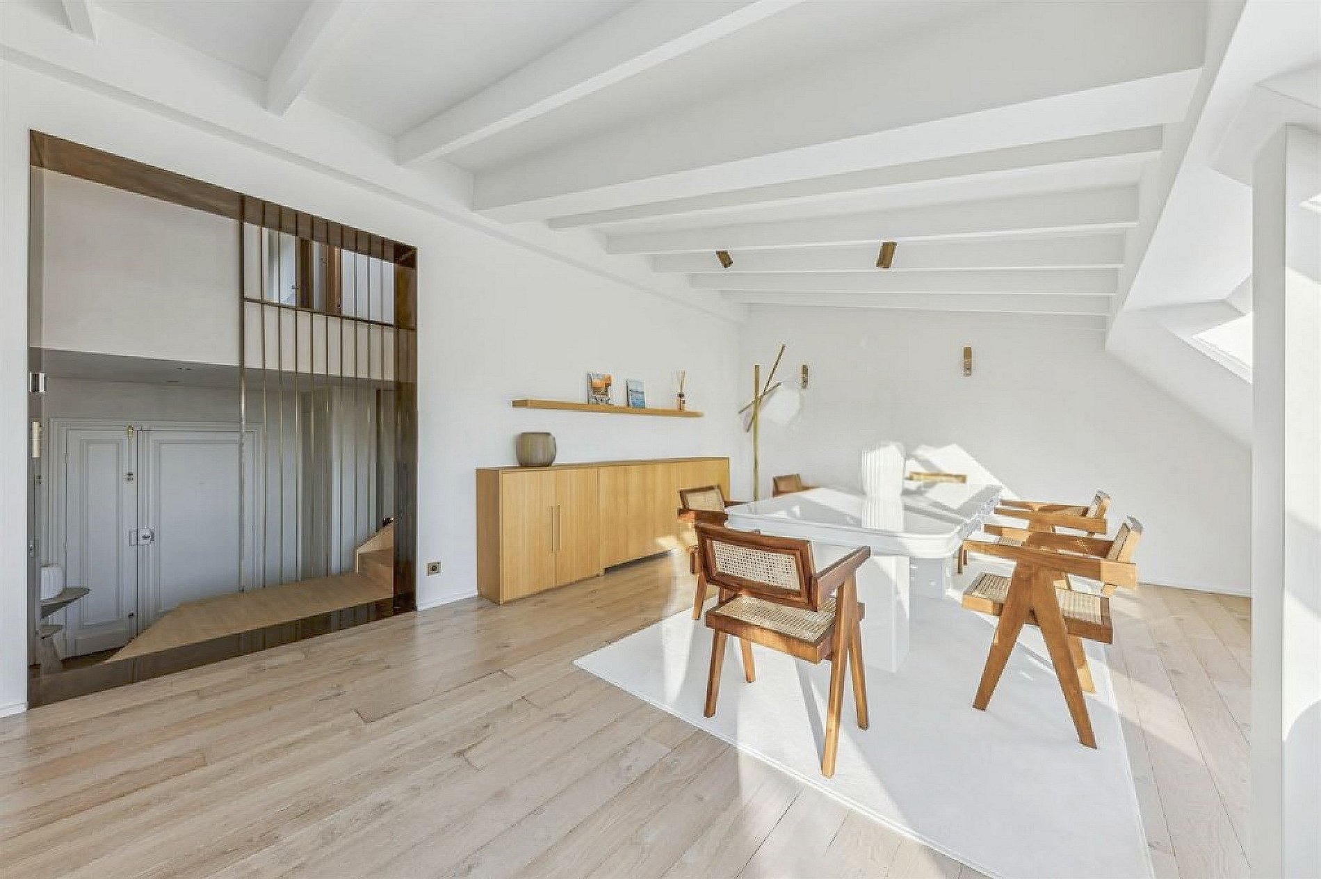 The interior embodies a minimalistic yet elegant design philosophy, where clean lines and serene spaces harmonize with refined materials like polished oak flooring, sleek marble surfaces, and subtle brass accents. Every detail has been meticulously curated to create an atmosphere of understated opulence, blending contemporary minimalism with timeless French elegance.