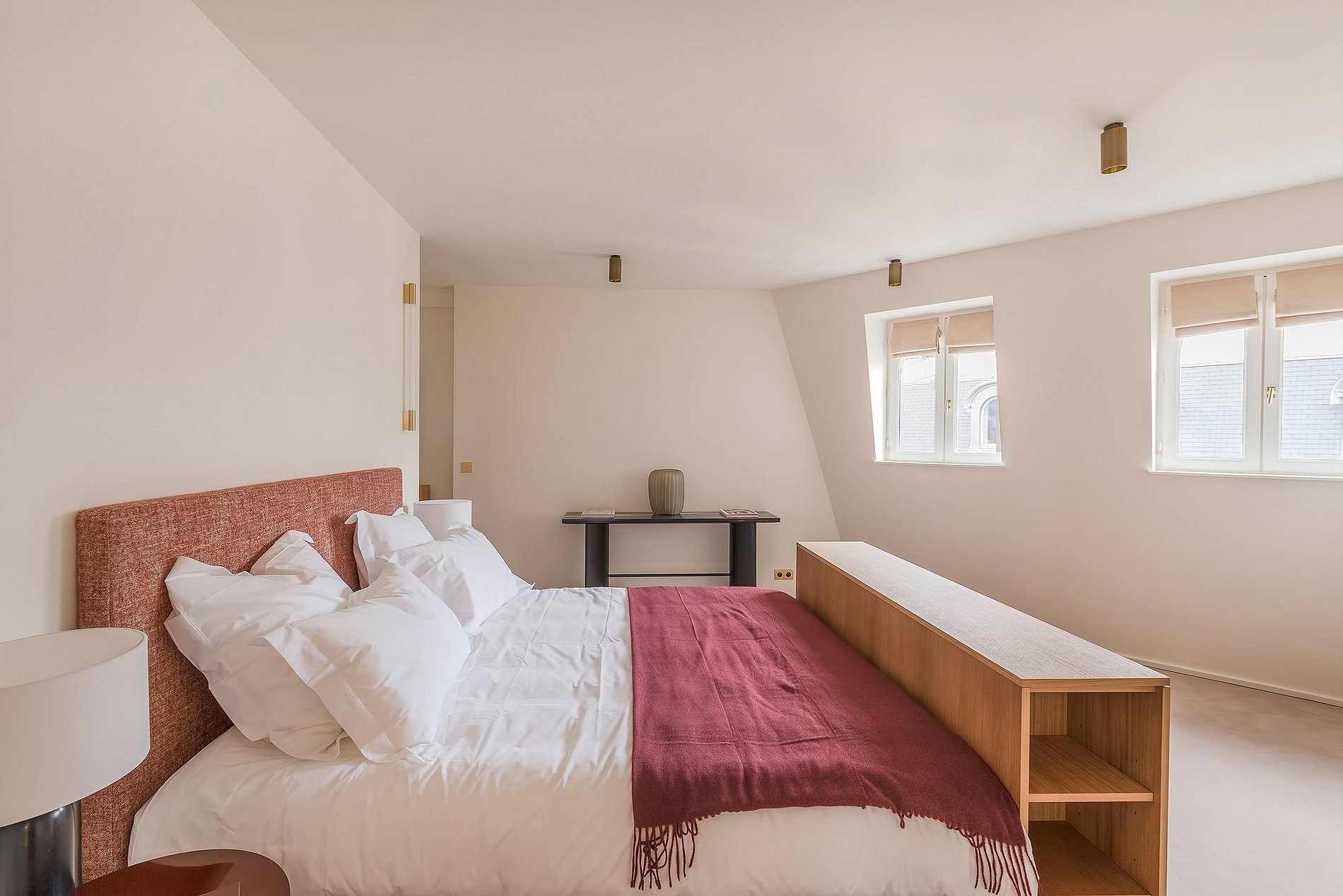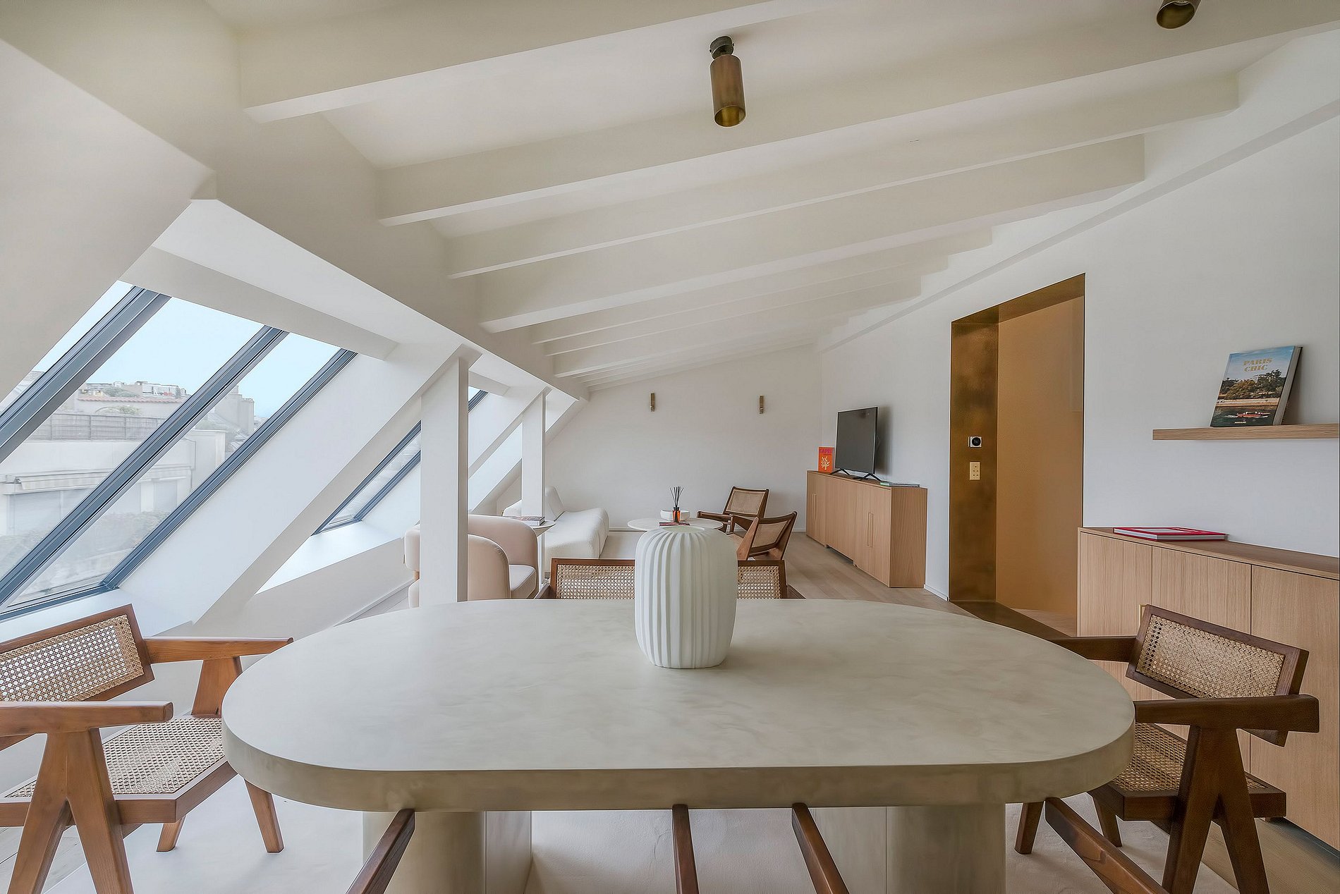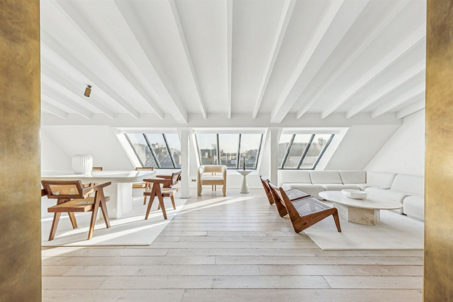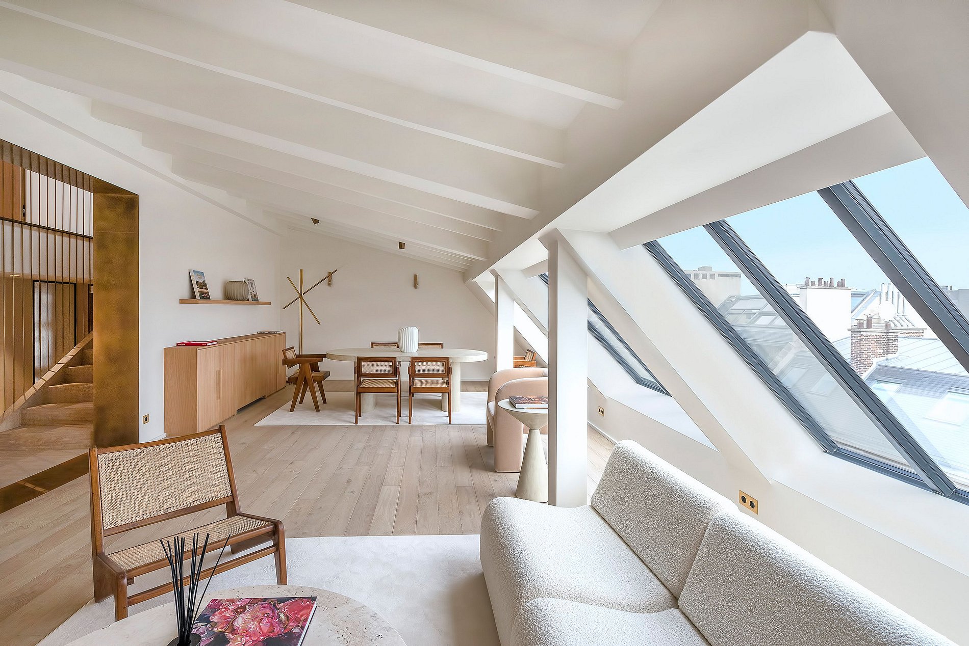 The interior embodies a minimalistic yet elegant design philosophy, where clean lines and serene spaces harmonize with refined materials like polished oak flooring, sleek marble surfaces, and subtle brass accents. Every detail has been meticulously curated to create an atmosphere of understated opulence, blending contemporary minimalism with timeless French elegance.