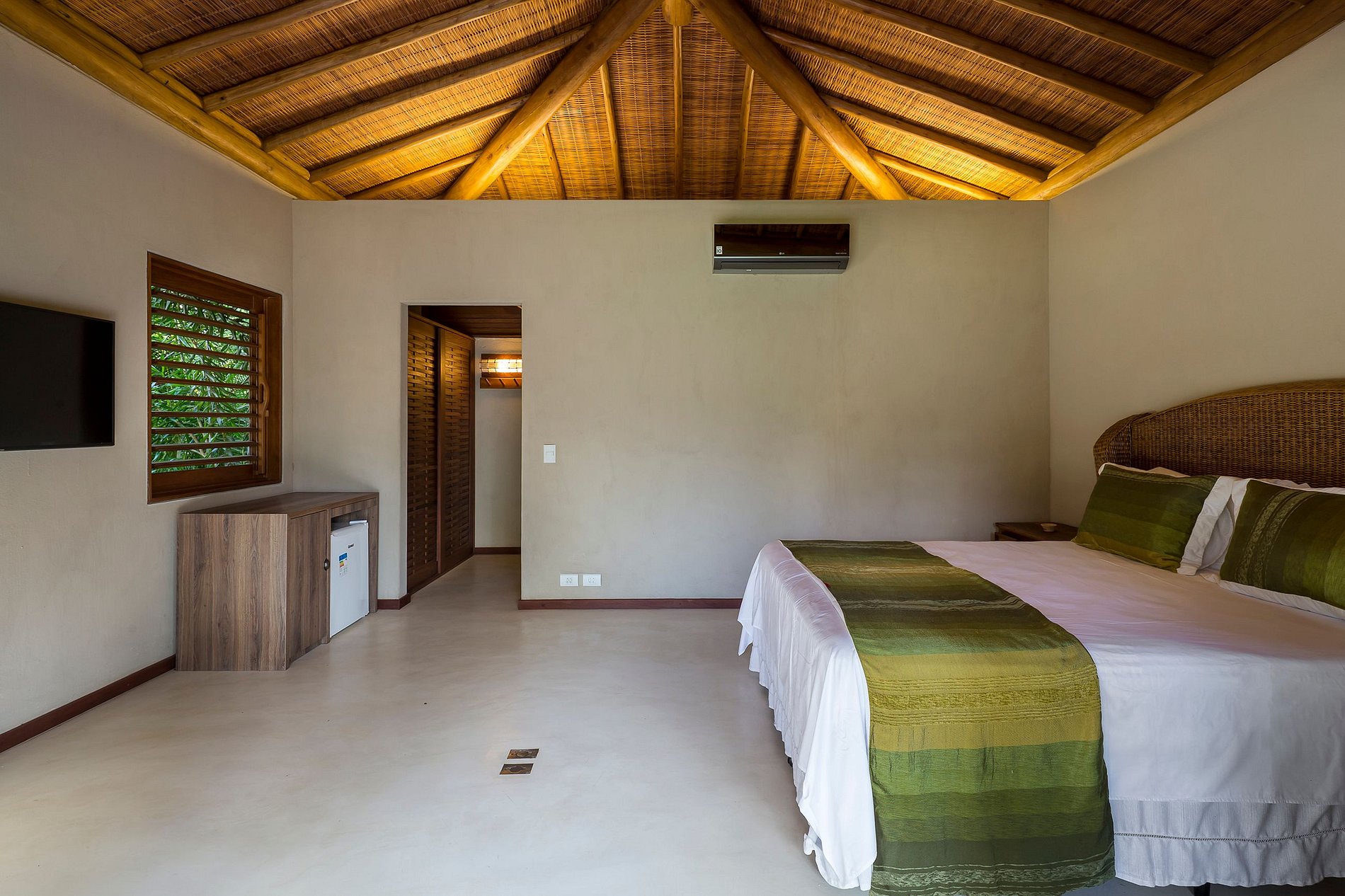 Each bungalow offers a Queen size bed, minibar, 50-inch Smart TV, split air conditioning, private bathroom and charming views of the garden with pool.