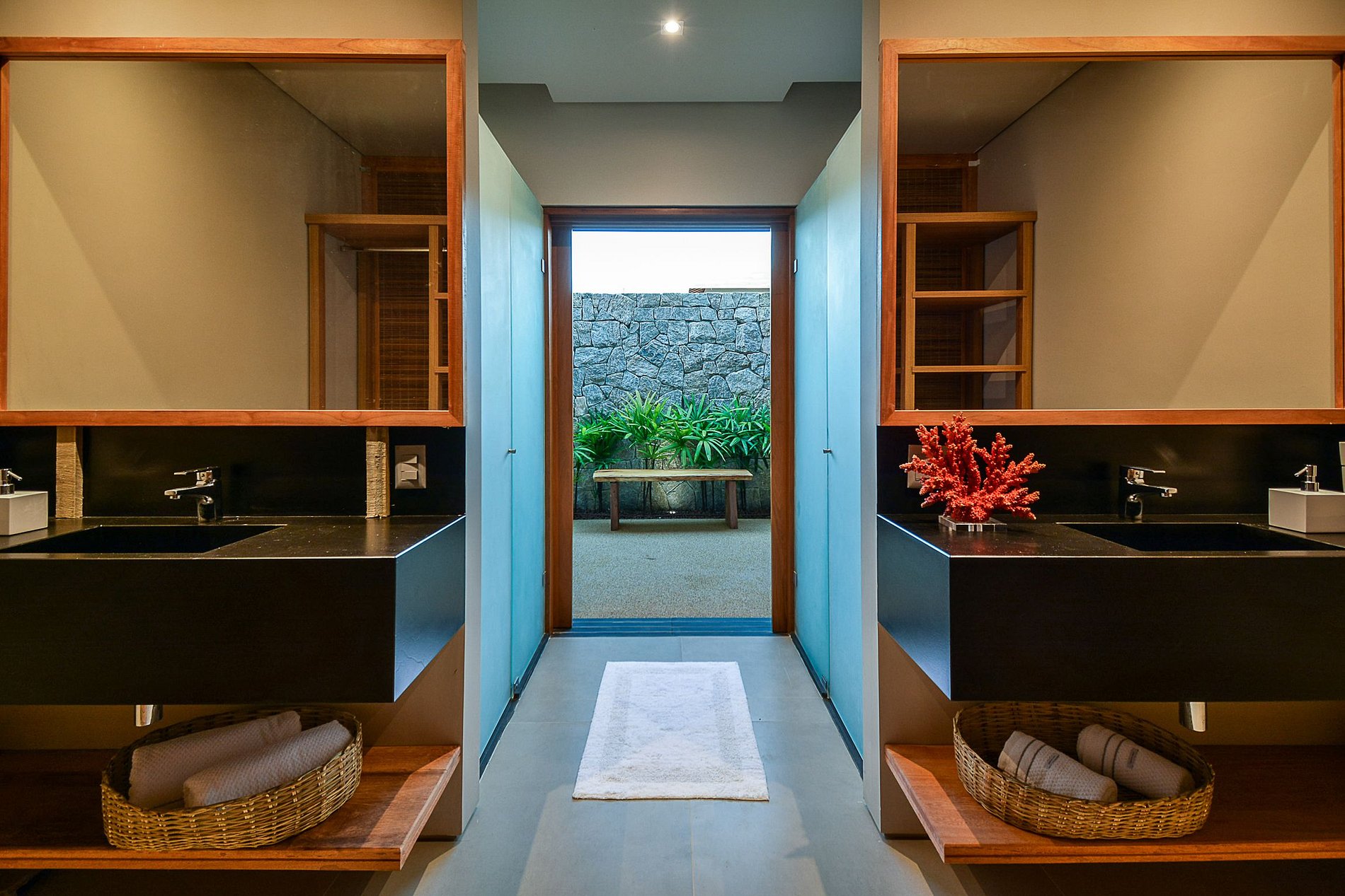 The living room is naturally well lit and features an eye-popping tropical design, which makes use of natural fiber from the walls to the ceiling, with a lot of refinement and luxury, in addition to a rich artificial lighting project.