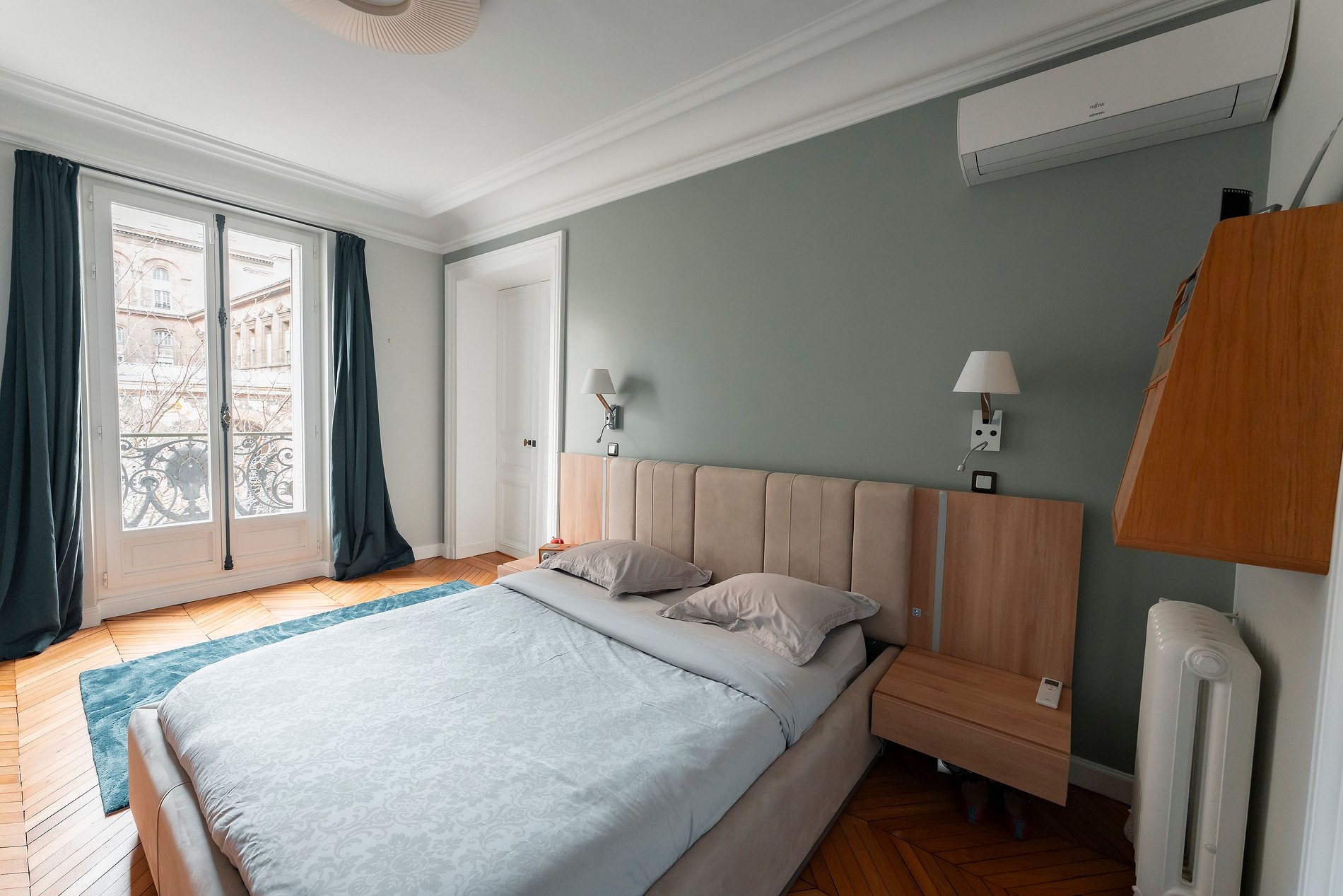 As you step into the apartment, you are greeted by a spacious and well-lit living area that seamlessly blends contemporary design with classic Parisian charm. The luxurious living spaces are perfect for relaxation and entertainment, offering a serene environment with tasteful décor and high-end finishes.