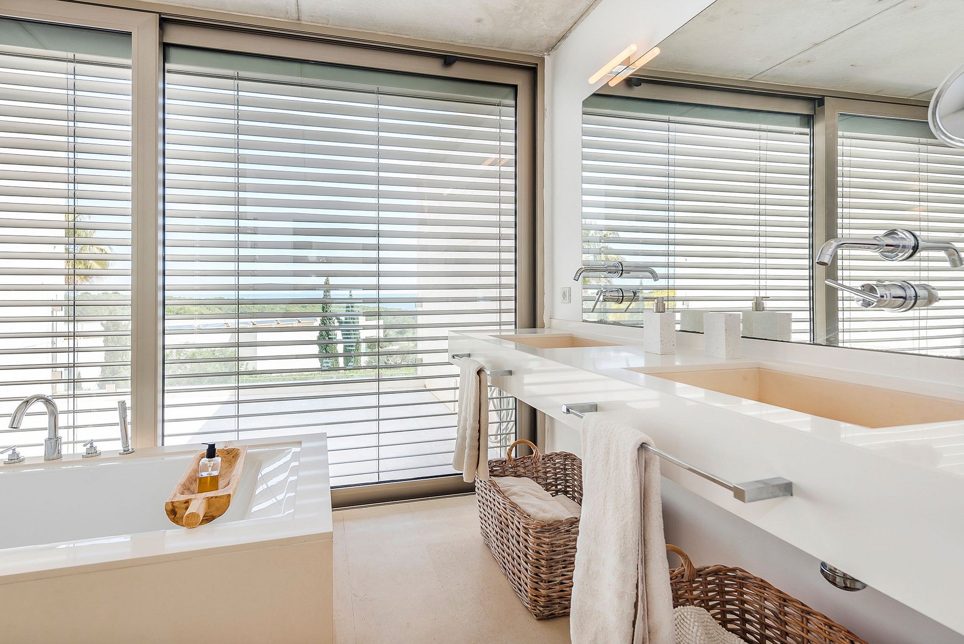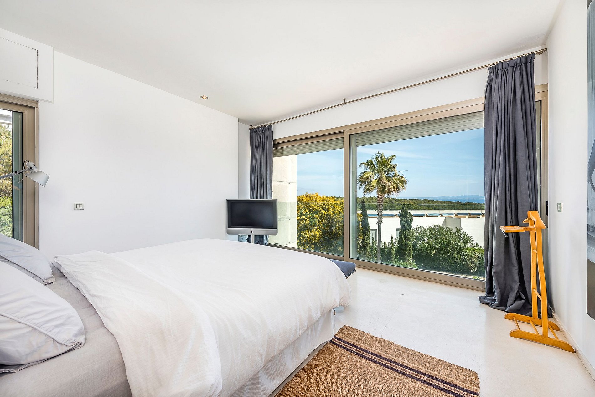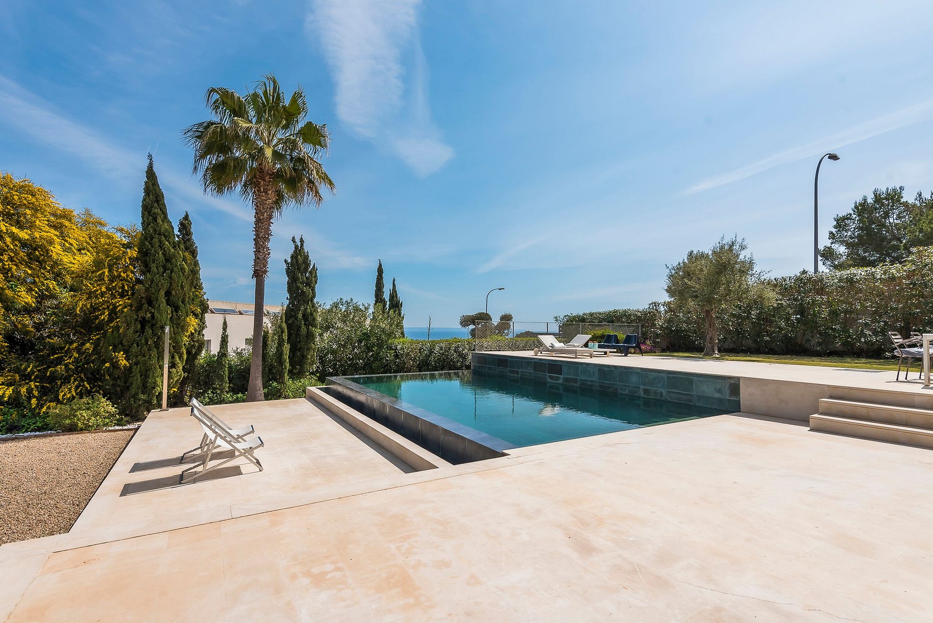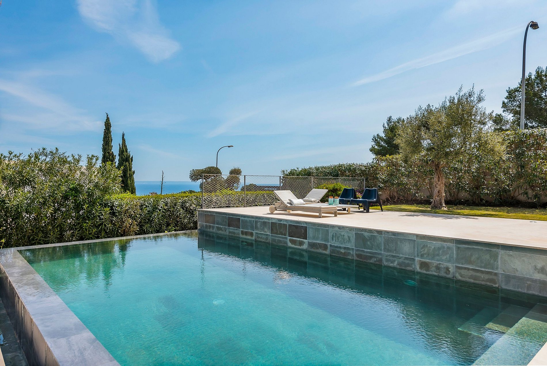 This tastefully furnished villa is situated in an elevated position in the first sea line in the noble Sol de Mallorca neighborhood and offers a dreamlike view over the bay of Palma.