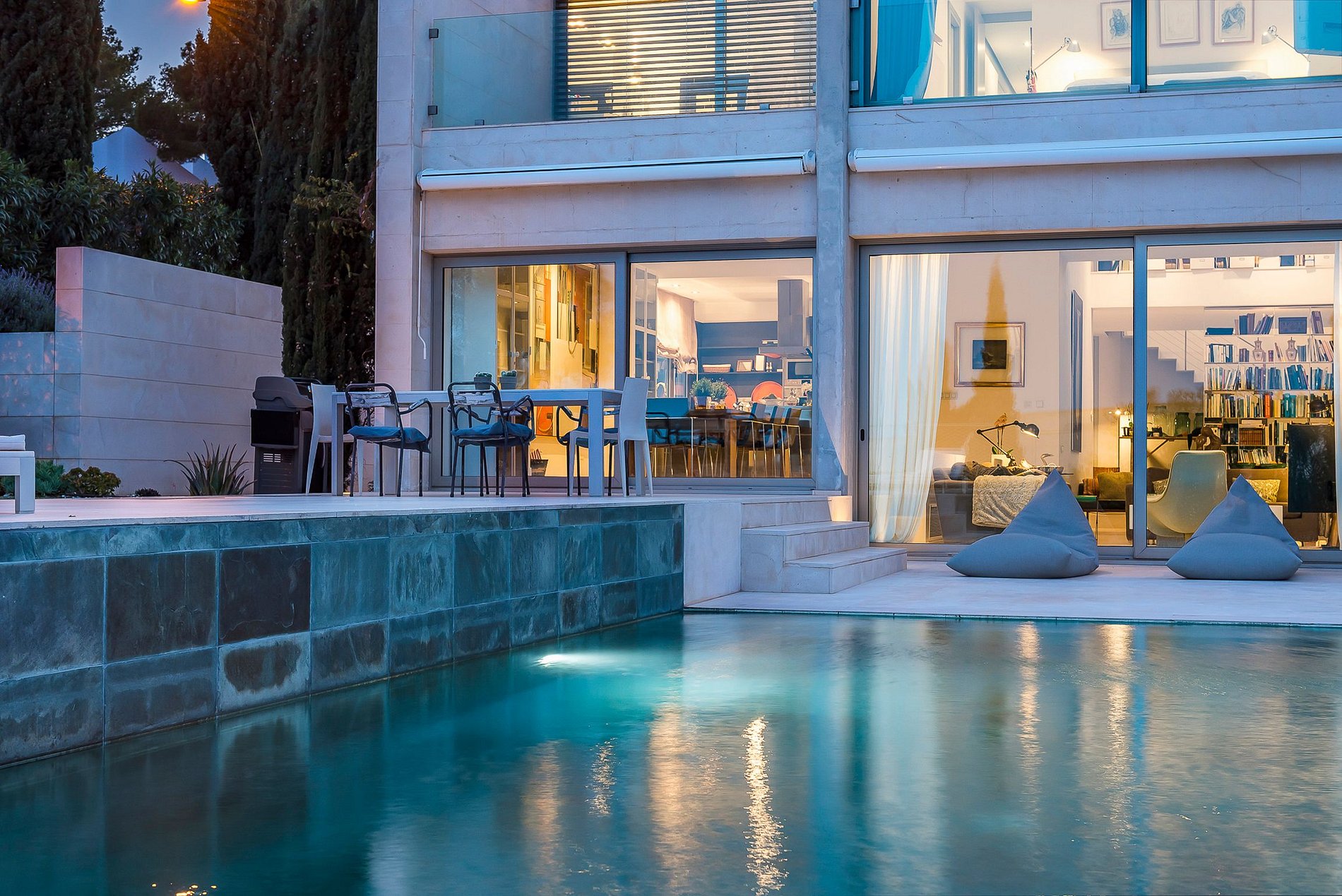 The house can accommodate up to 8 guests on 450 sqm living space spread over two floors that include 4 double bedrooms with en-suite bathrooms. There is a state-of-the-art and fully equipped kitchen.