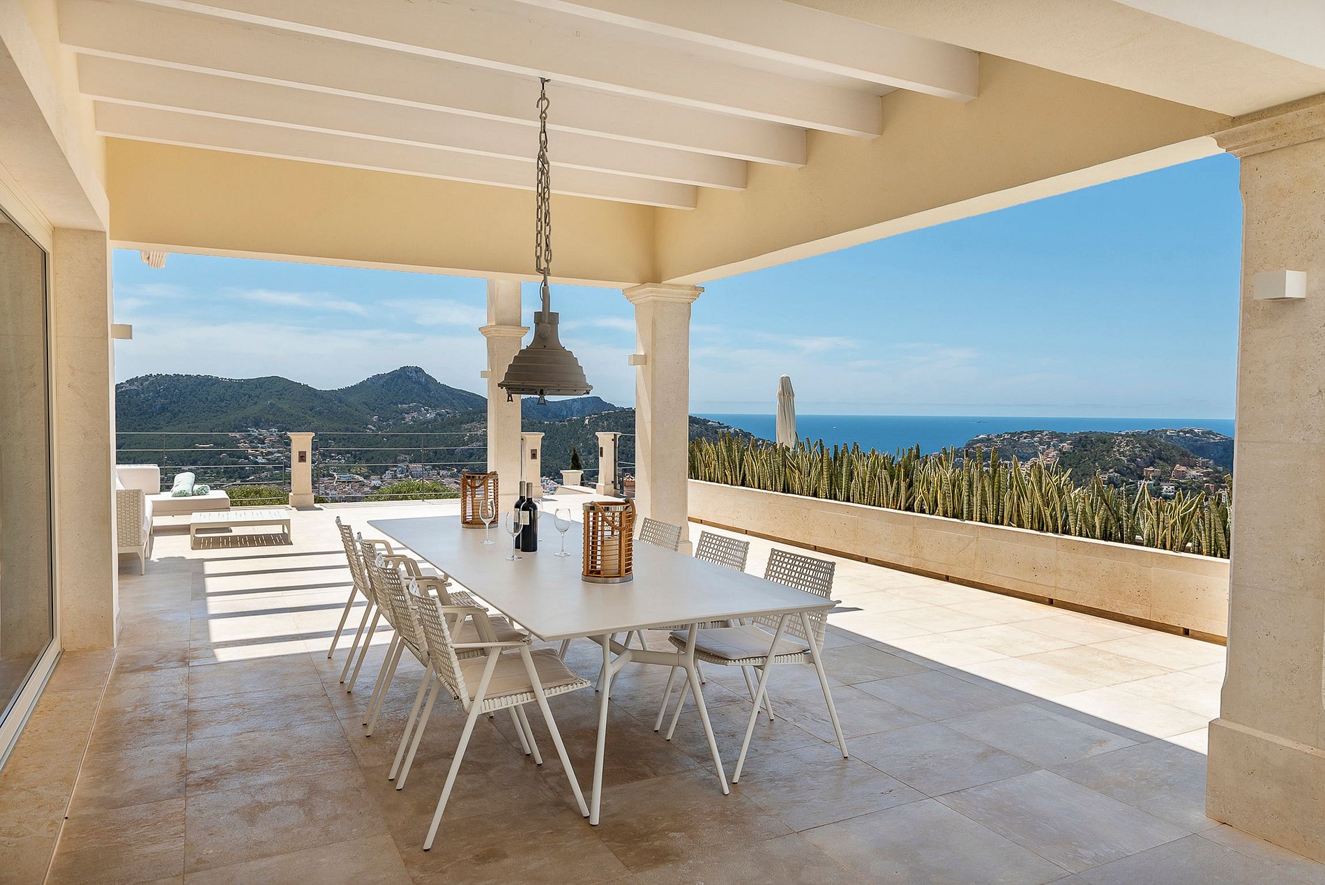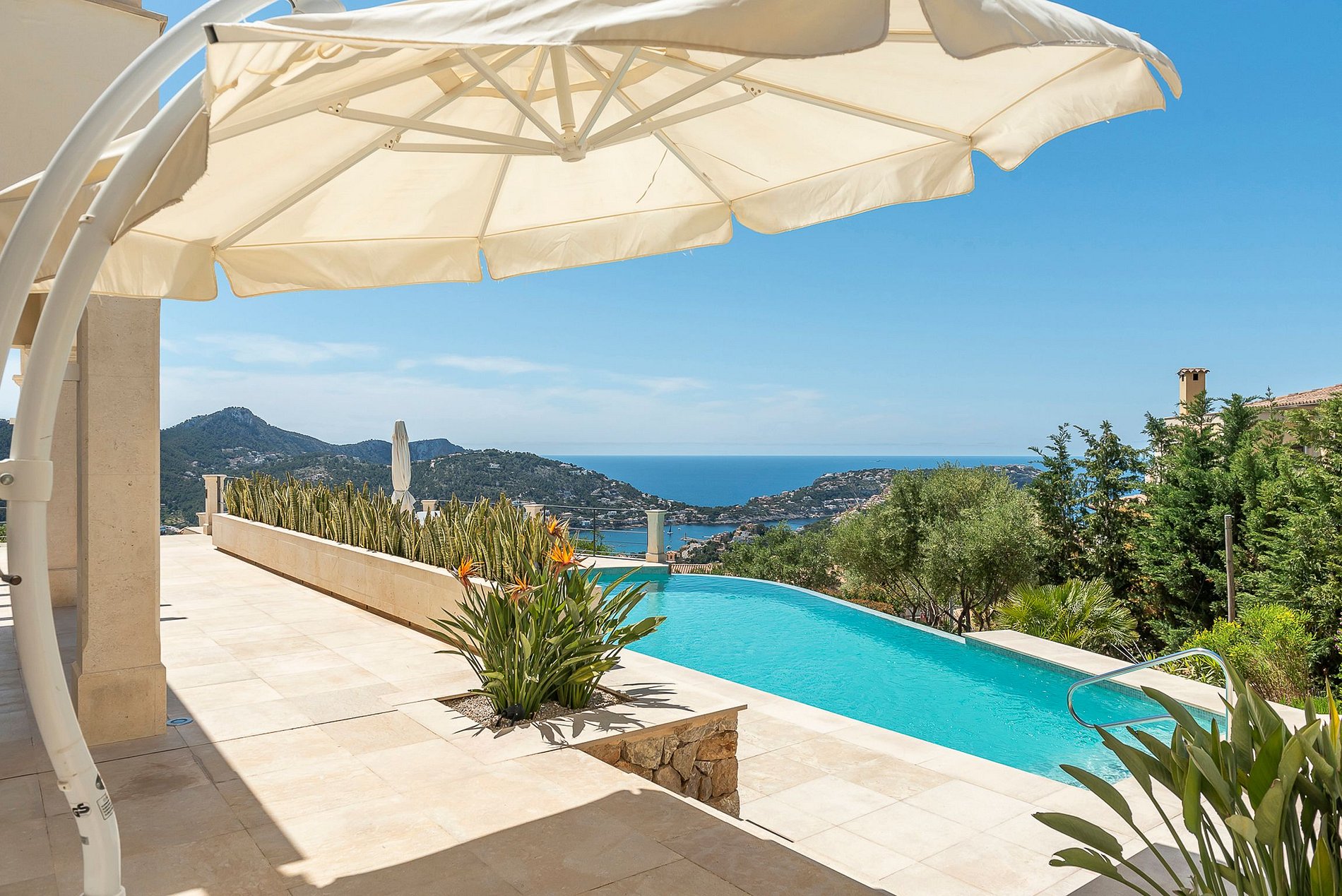 The outdoor part has partially covered terrace sections, a large infinity pool and chill-out furniture, most of the time of the year facing the sun thanks to its south-west orientation.
