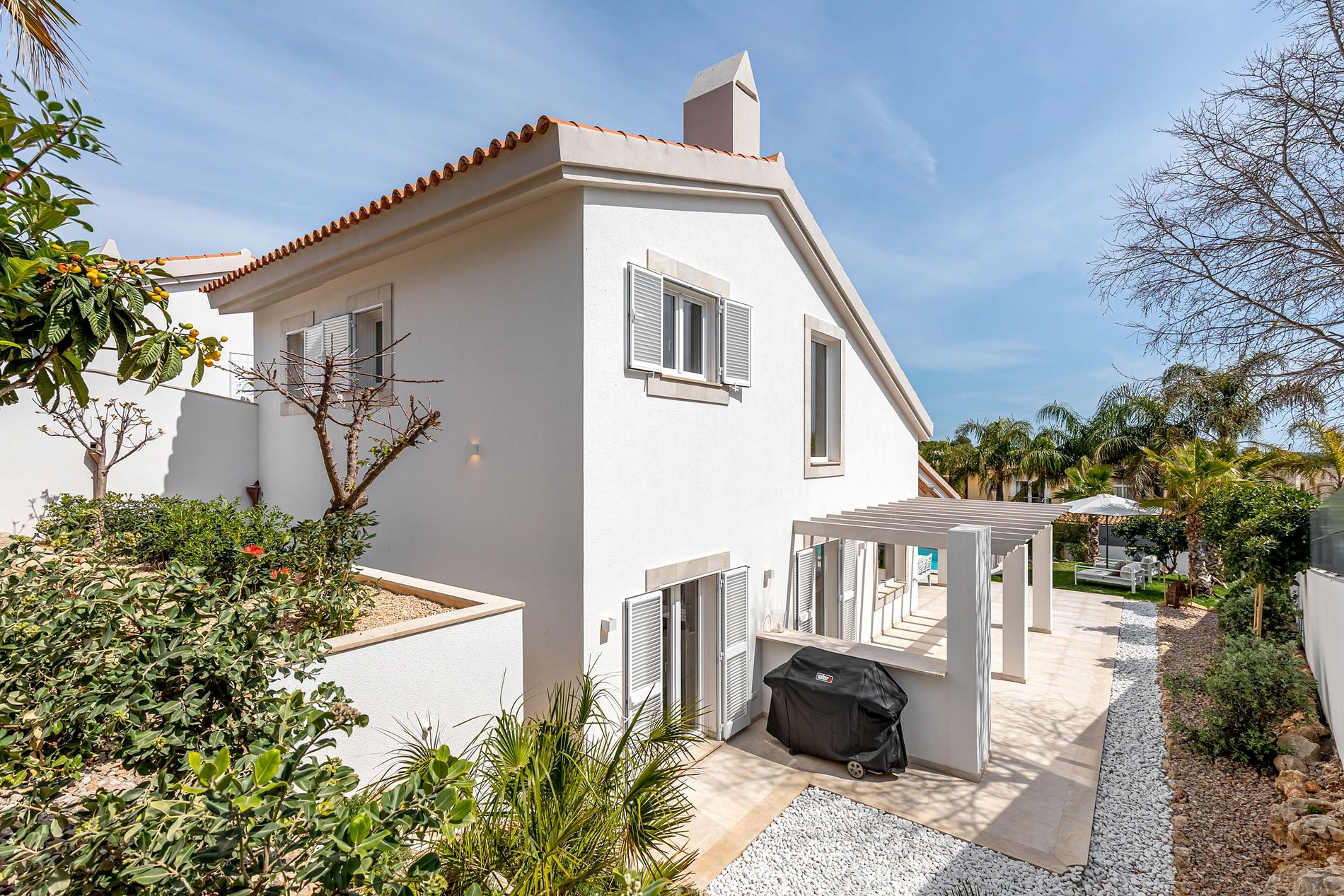 Outside, guests can enjoy time by a large dining table and a lovely Ibizan-style chill-out lounge. A Weber gas barbecue for cozy barbecue evenings is also available to guests. The kidney-shaped pool is surrounded by a well-kept green area.