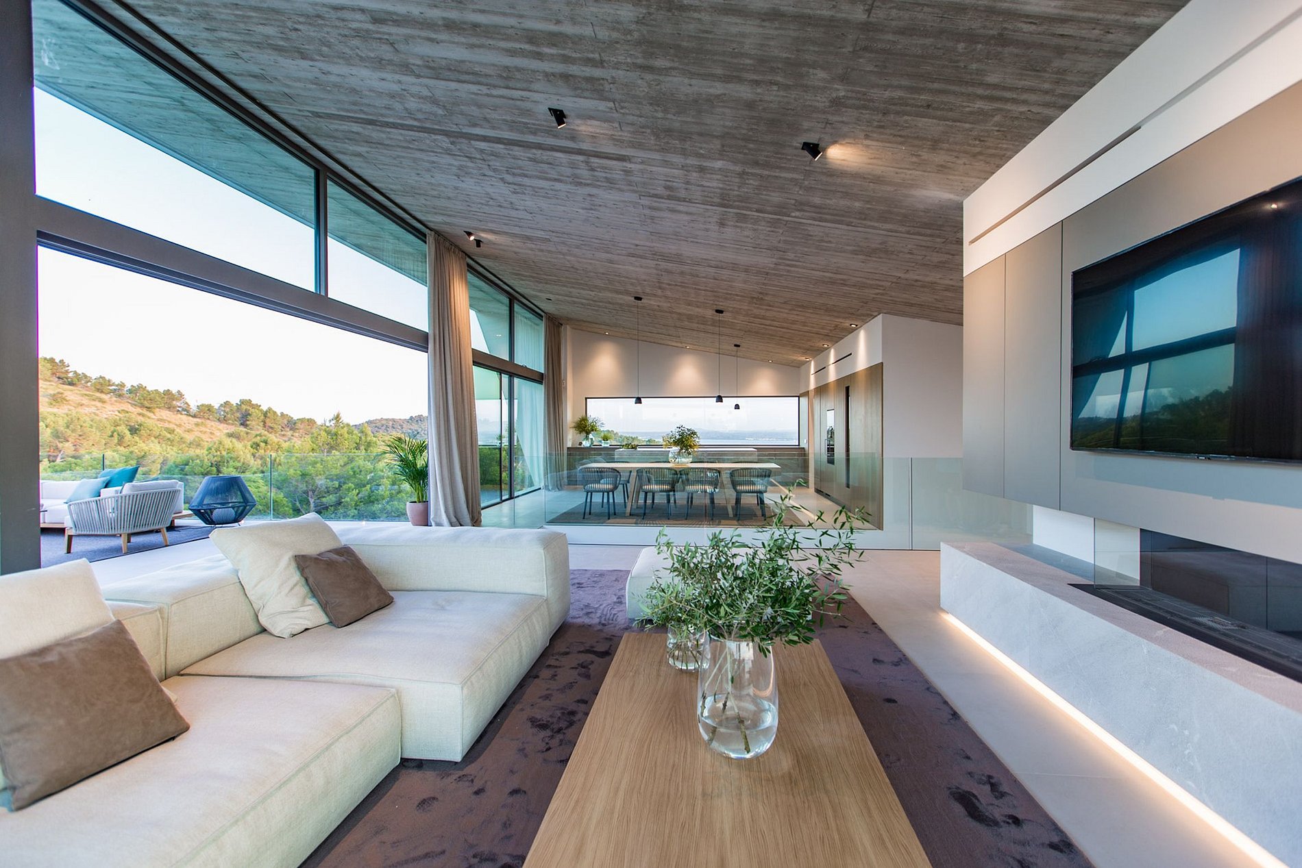 Upstairs is the open plan kitchen/living room with panoramic windows, a cozy living area with gas fireplace, and terrace with a Jacuzzi pool. The villa also has a lift and an in-house sauna.