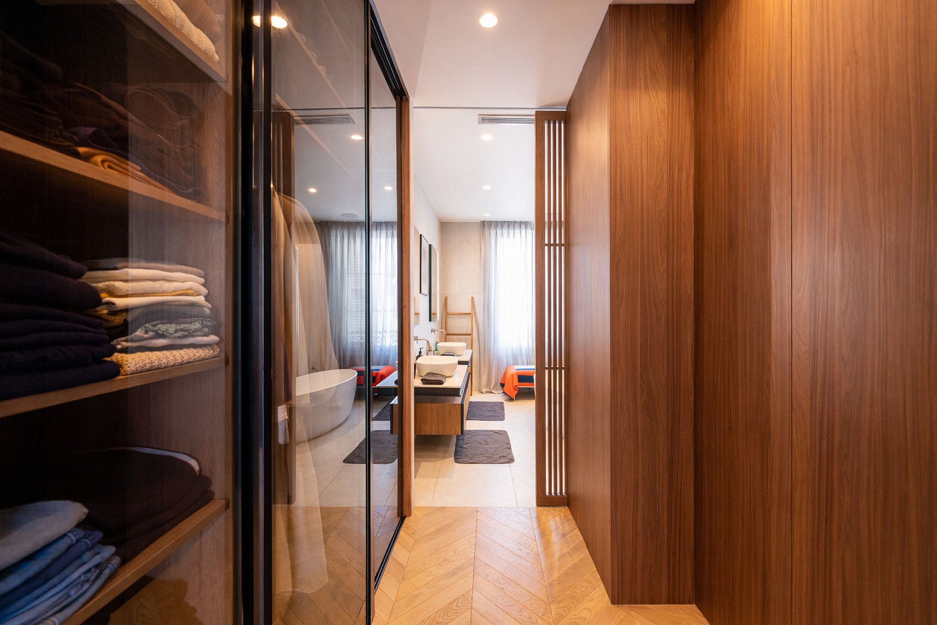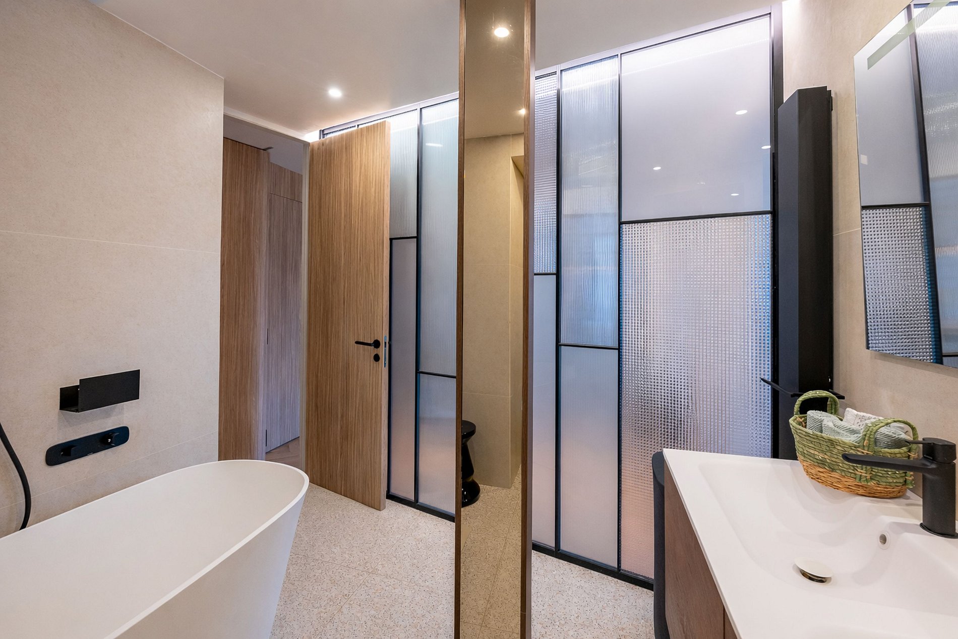On one side, the apartment houses a vast suite, a true sanctuary of tranquility, with its own hammam, offering unparalleled luxury and relaxation. On the other side, a well-arranged sleeping area includes four comfortable bedrooms and two elegant bathrooms, designed for the well-being of its occupants.
