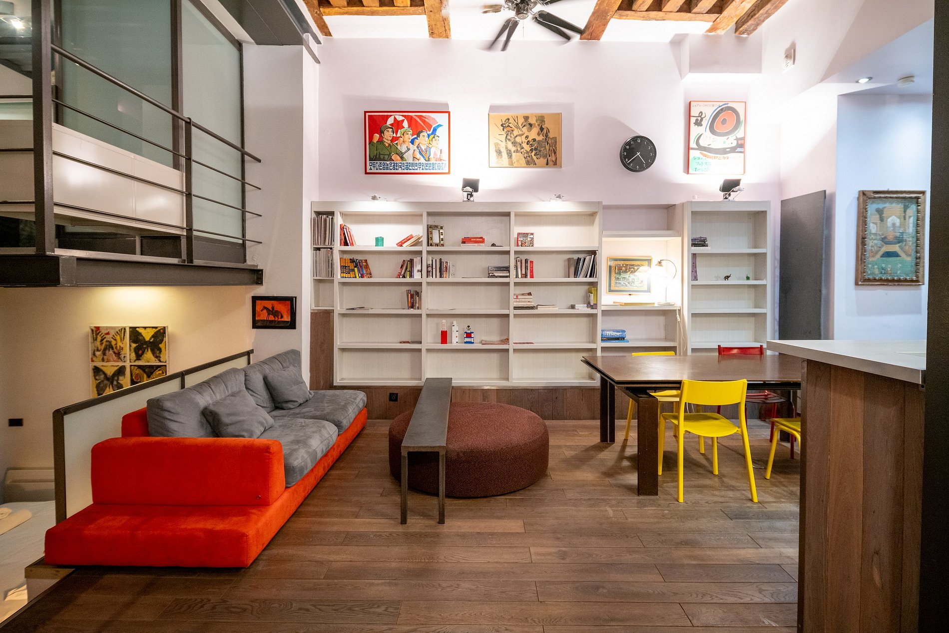On the left, a few steps lead up to a second sleeping space, offering additional accommodation. This elevated area adds an element of separation and privacy, making the loft ideal for hosting guests or for a small family.