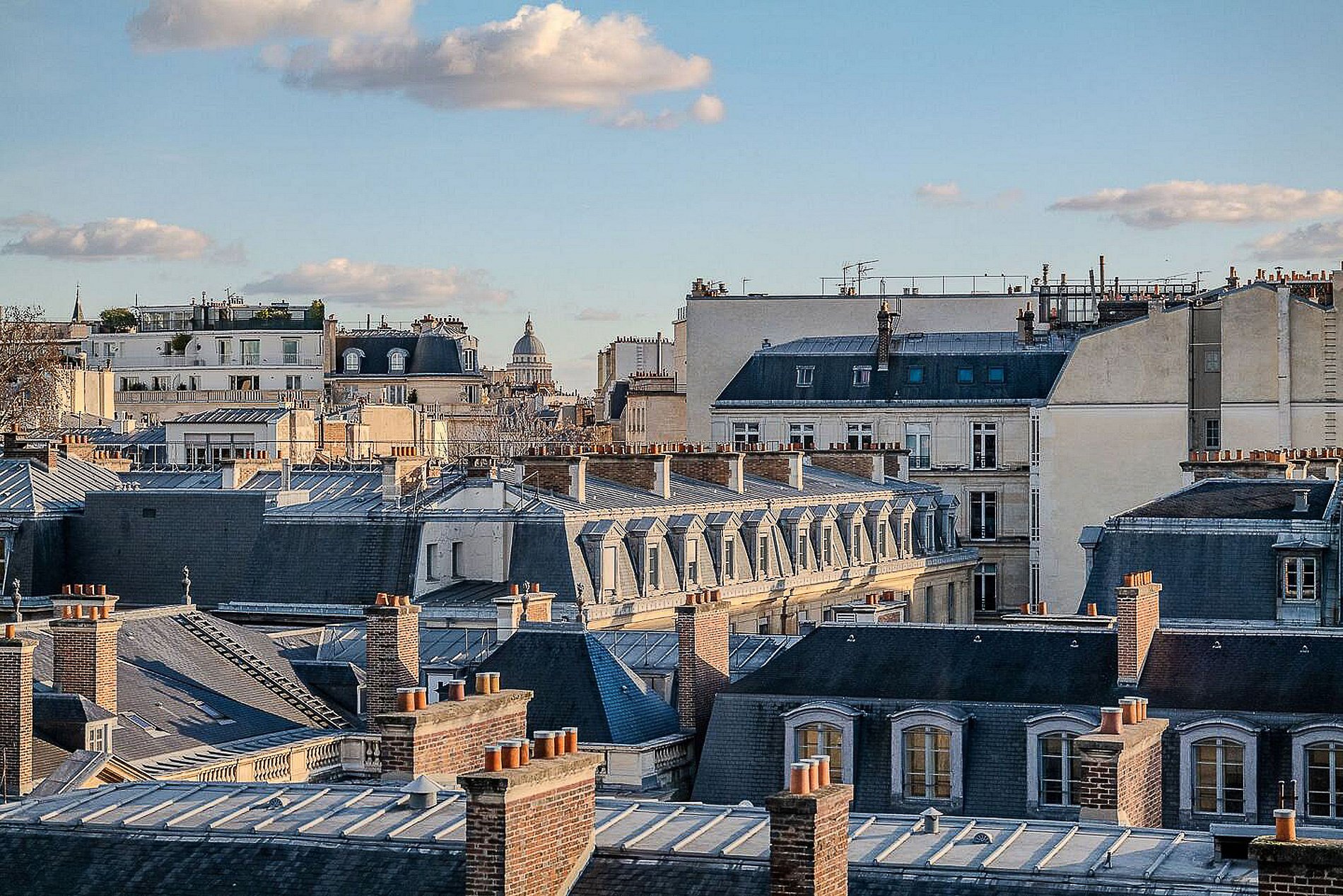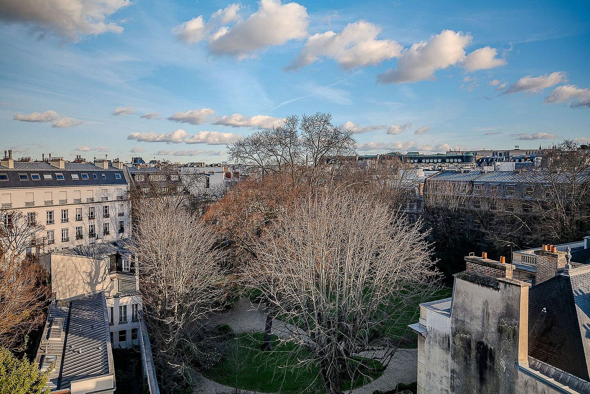 Spectacular Panoramic Views: Each window frames iconic vistas of Paris. A long balcony offers breathtaking street-side views, including the Eiffel Tower, the golden dome of Les Invalides, the towers of La Défense, and the majestic Panthéon. The rear windows reveal a tranquil view over the charming gardens of Karl Lagerfeld’s former mansion.