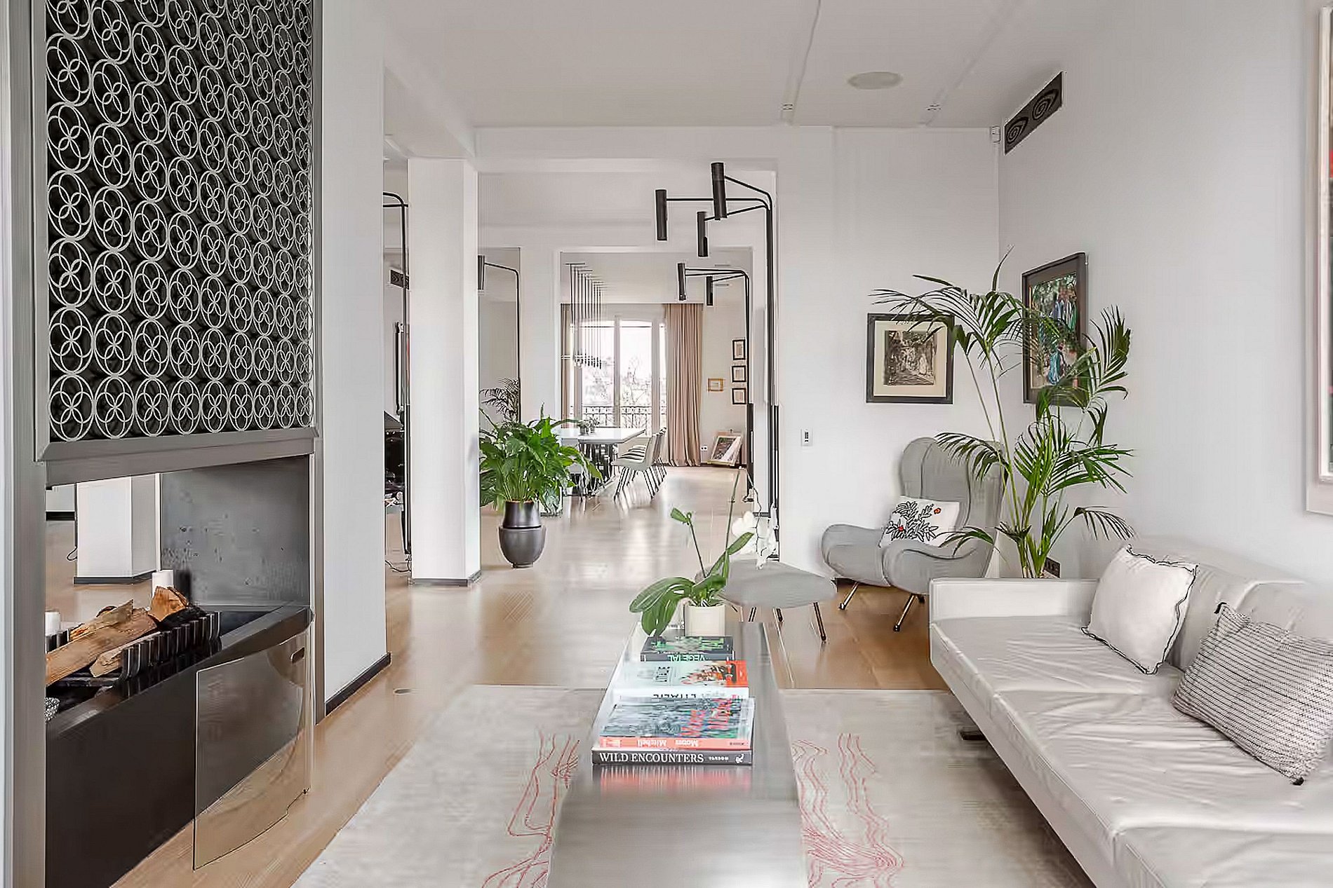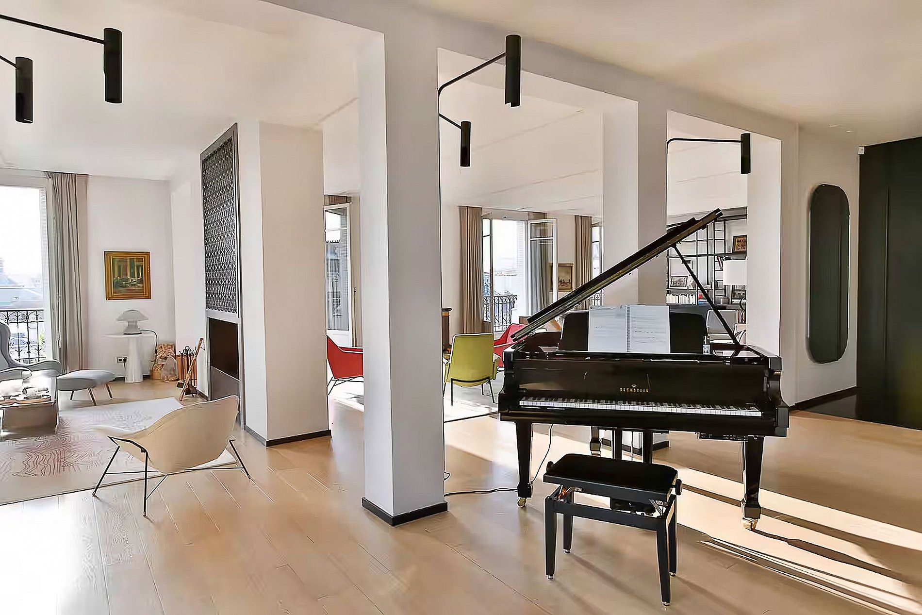 Spectacular Panoramic Views: Each window frames iconic vistas of Paris. A long balcony offers breathtaking street-side views, including the Eiffel Tower, the golden dome of Les Invalides, the towers of La Défense, and the majestic Panthéon. The rear windows reveal a tranquil view over the charming gardens of Karl Lagerfeld’s former mansion.