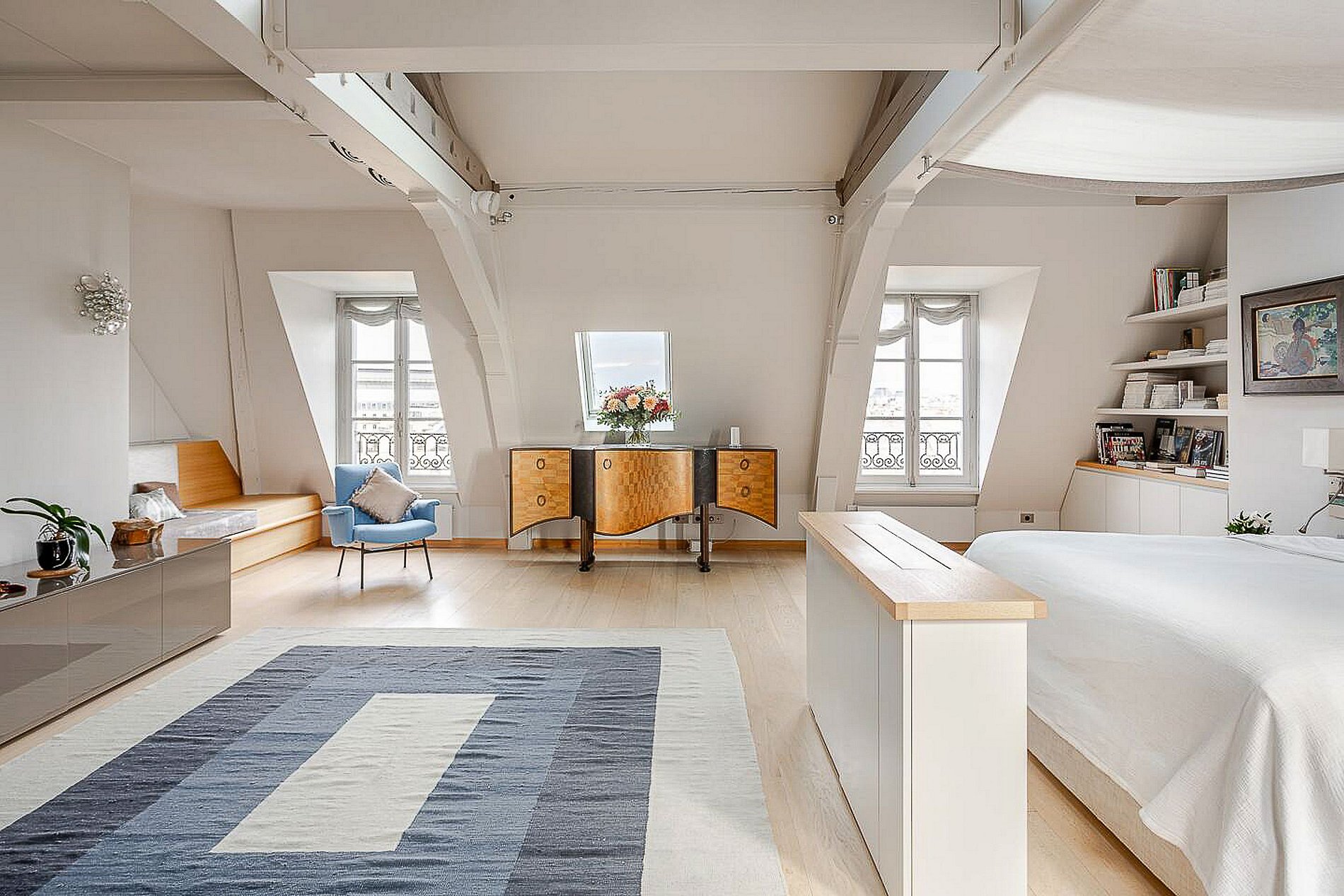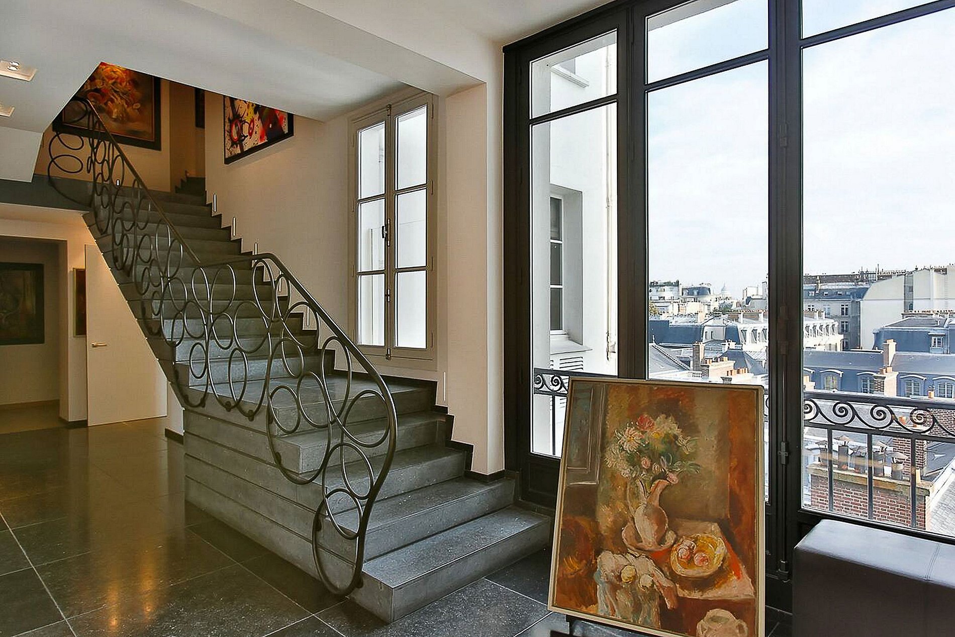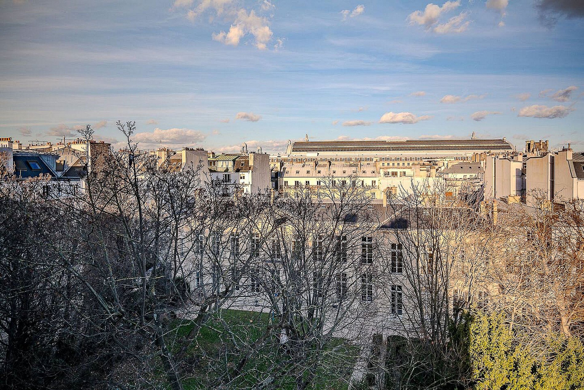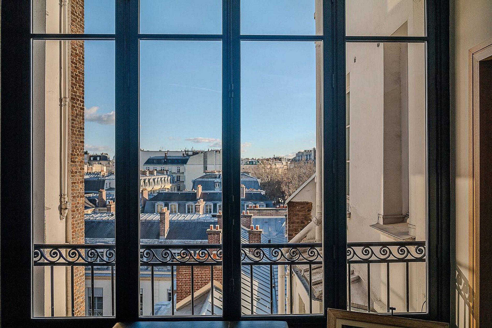 Spectacular Panoramic Views: Each window frames iconic vistas of Paris. A long balcony offers breathtaking street-side views, including the Eiffel Tower, the golden dome of Les Invalides, the towers of La Défense, and the majestic Panthéon. The rear windows reveal a tranquil view over the charming gardens of Karl Lagerfeld’s former mansion.