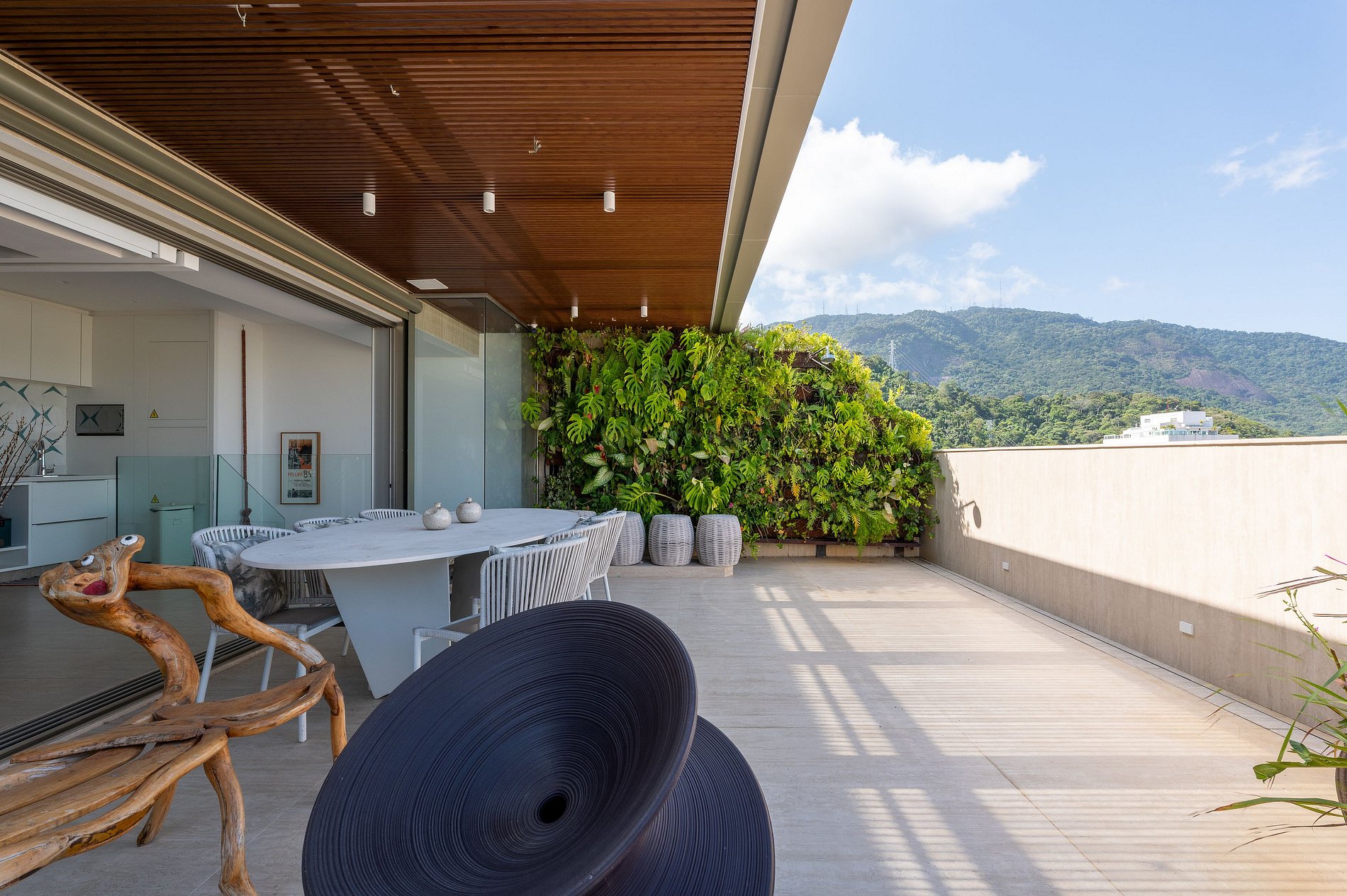 The terrace is thoughtfully laid out to enjoy every moment outdoors: a comfortable lounge area for sunset drinks or quiet reading with Christ the Redeemer in view, and an open-air dining space for shaded lunches or candlelit dinners under the stars. This level is a suspended sanctuary, where you live outside as much as inside, in an ambiance that is chic, natural, and deeply calming.