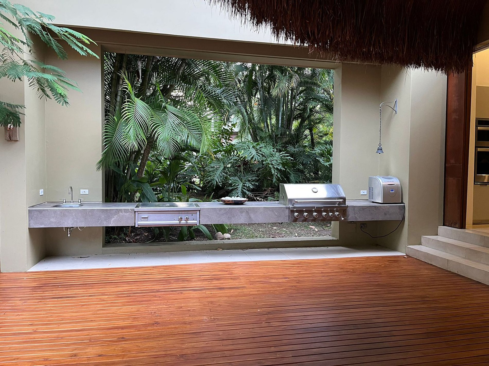 Step outside to discover a large palapa kiosk near the refreshing pool, surrounded by lush greenery. The outdoor space beckons with a BBQ area, an additional dining room, and a lounge space, creating a perfect setting for relaxation and socializing.