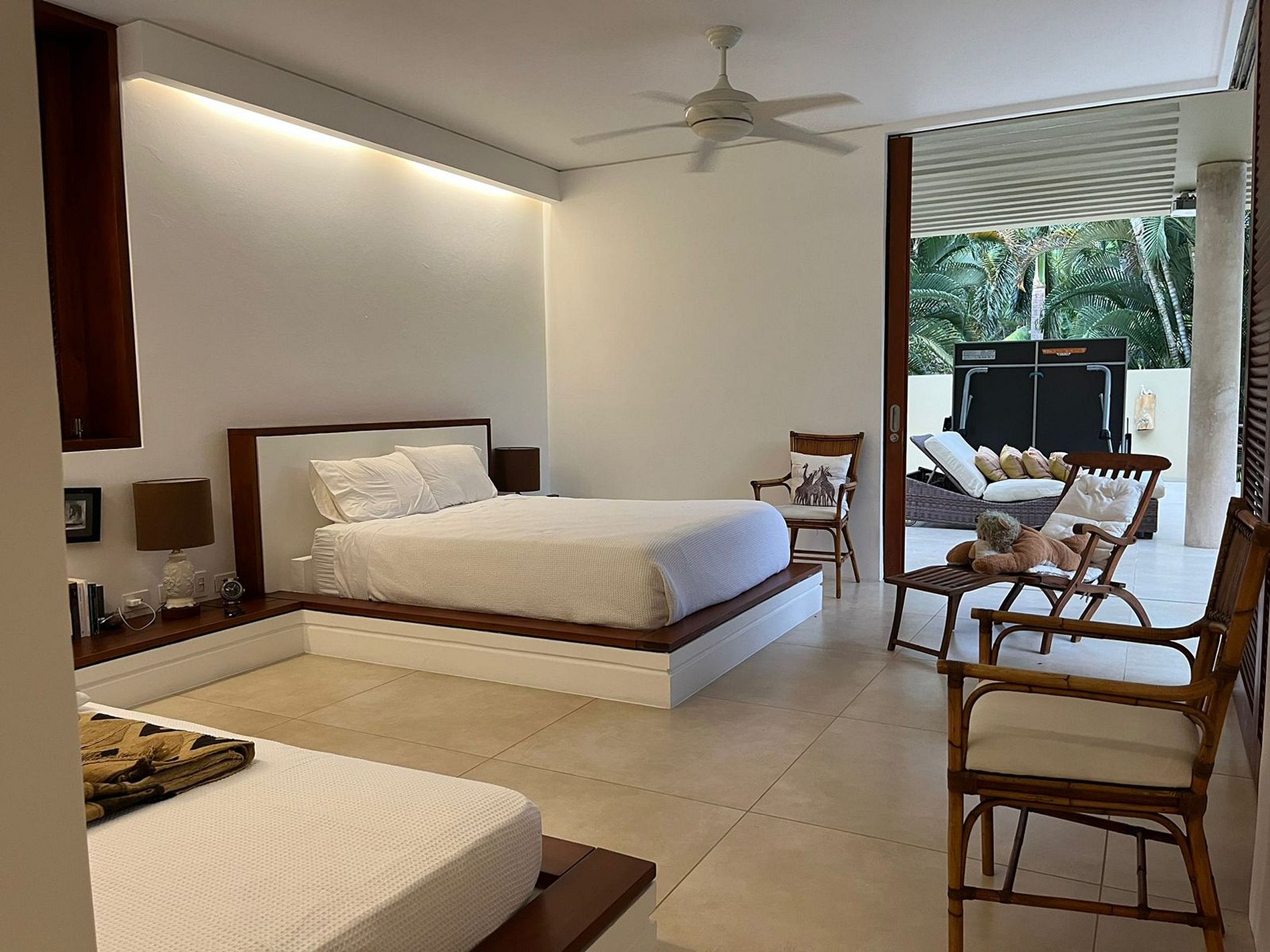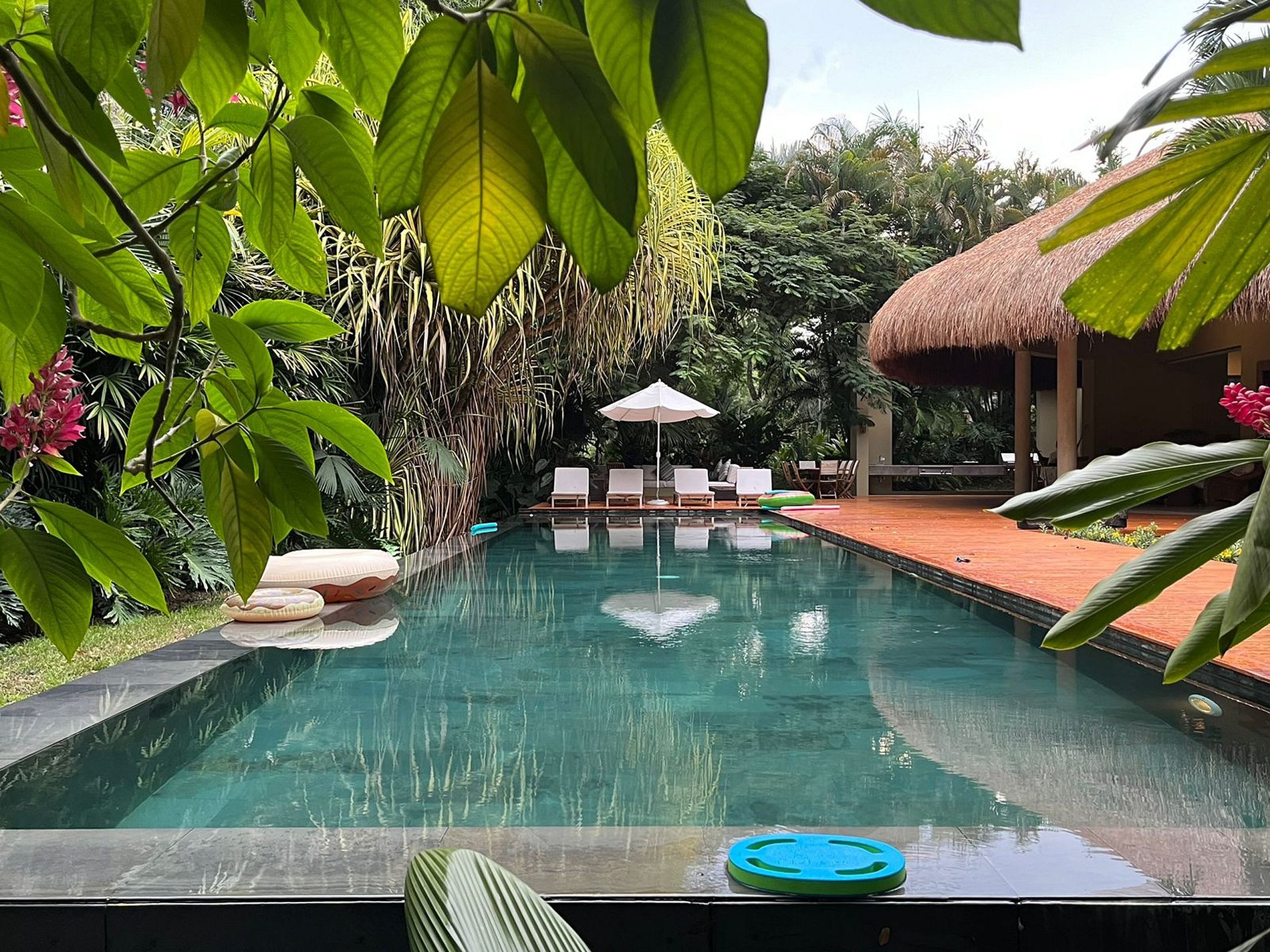 Step outside to discover a large palapa kiosk near the refreshing pool, surrounded by lush greenery. The outdoor space beckons with a BBQ area, an additional dining room, and a lounge space, creating a perfect setting for relaxation and socializing.
