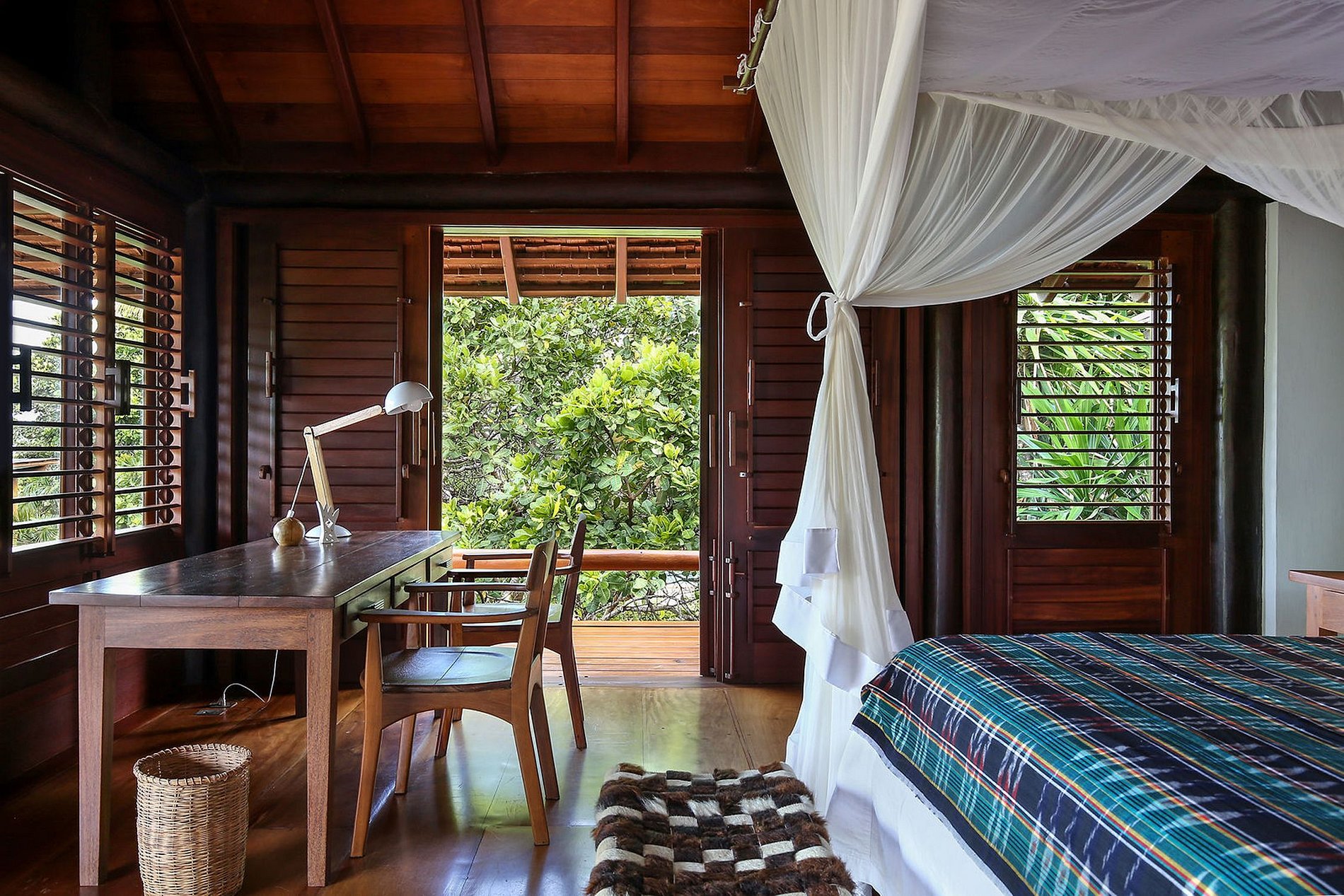 -Suite 09: Air-conditioned queen four-poster bed, TV, writing desk, river, and tropical garden