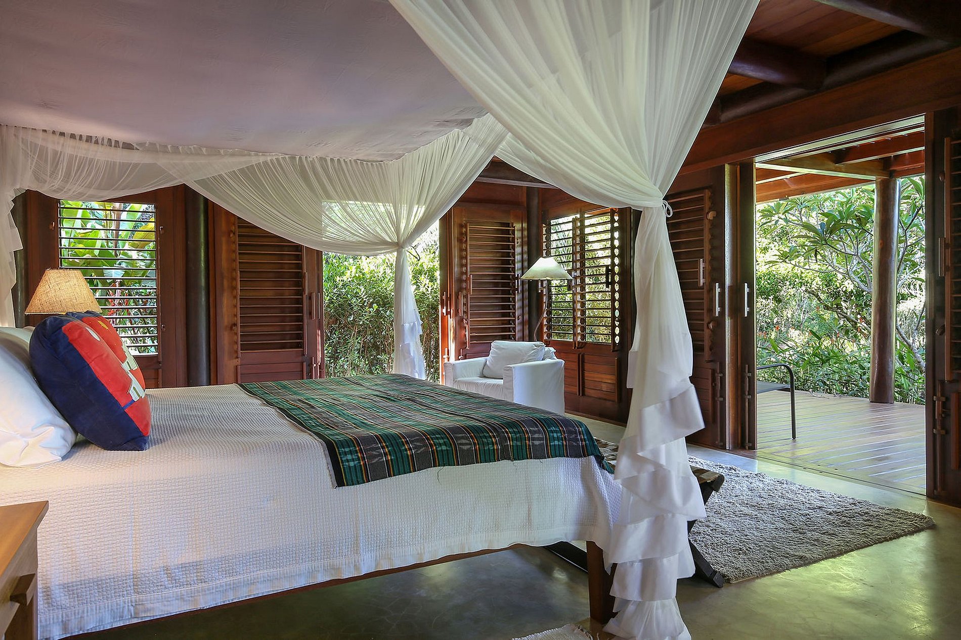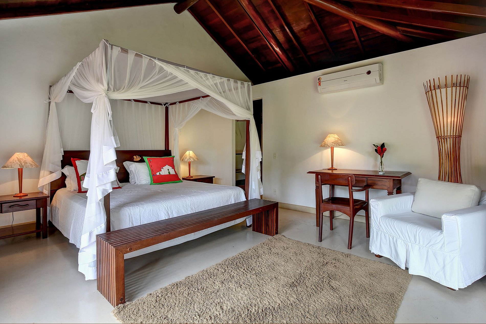 -Master 01: King four-poster bed, air conditioning, TV, writing desk, walk-in closet, balcony, double shower (int and ext), river and sea views.
