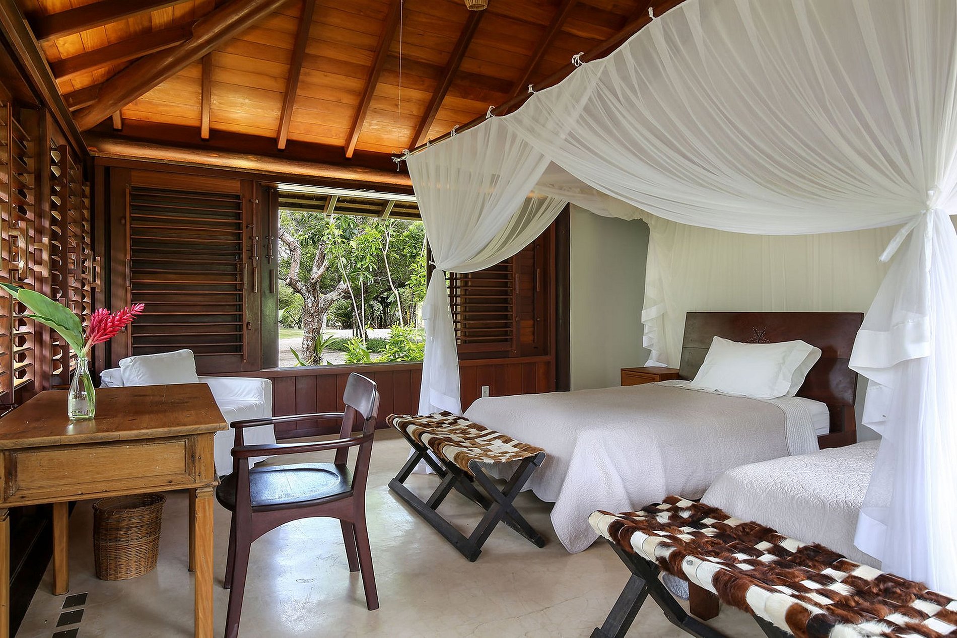 -Suite 07: Air-conditioned queen four-poster bed, TV, writing desk, river, and tropical garden