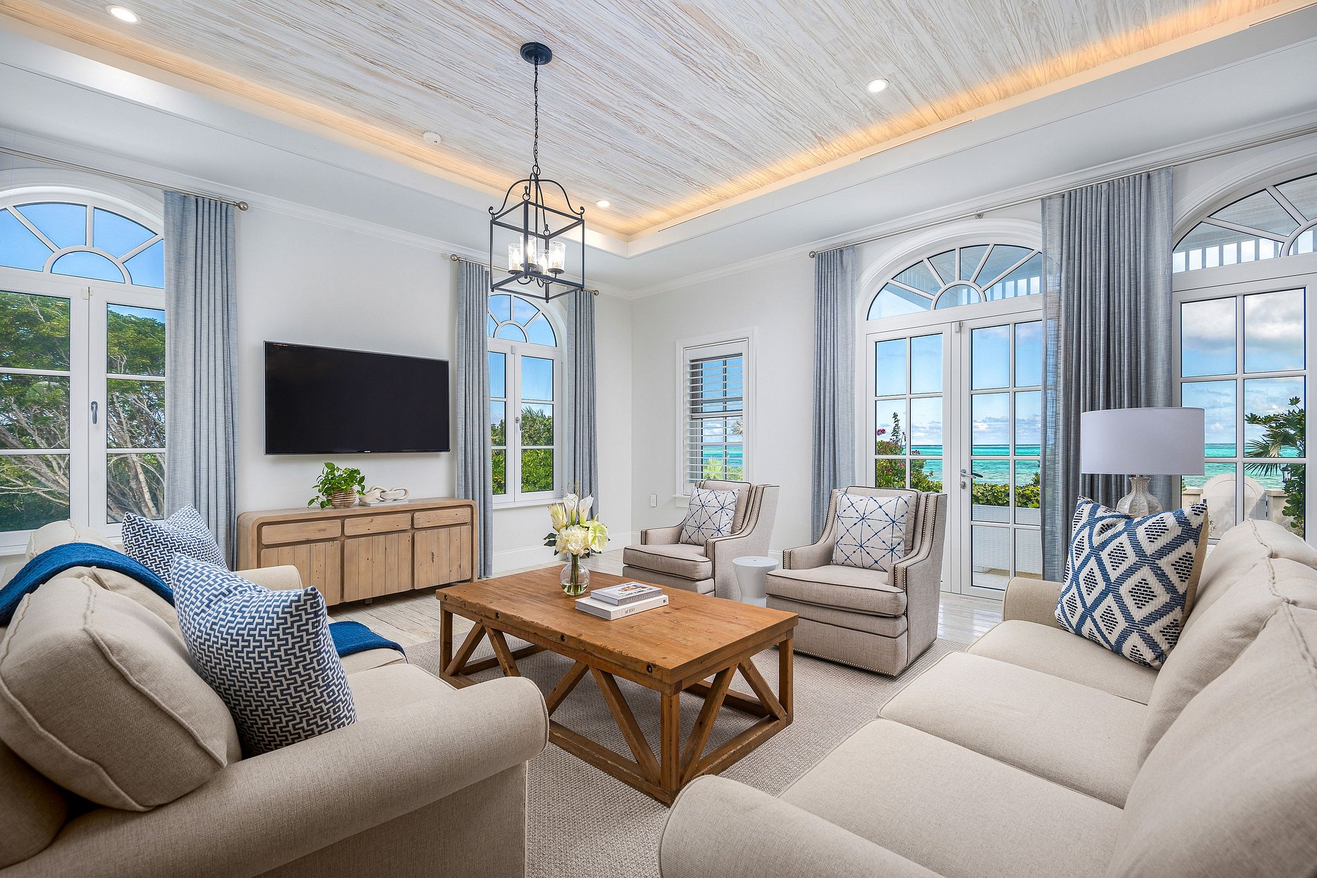 Set in the charming Turtle Cove area of Grace Bay, this elegant six-bedroom villa offers a serene blend of traditional design and island comfort, just steps from the beach. Surrounded by tropical vegetation, the home features wide wraparound verandas, graceful stone arches, and tranquil views of turquoise waters from nearly every angle.