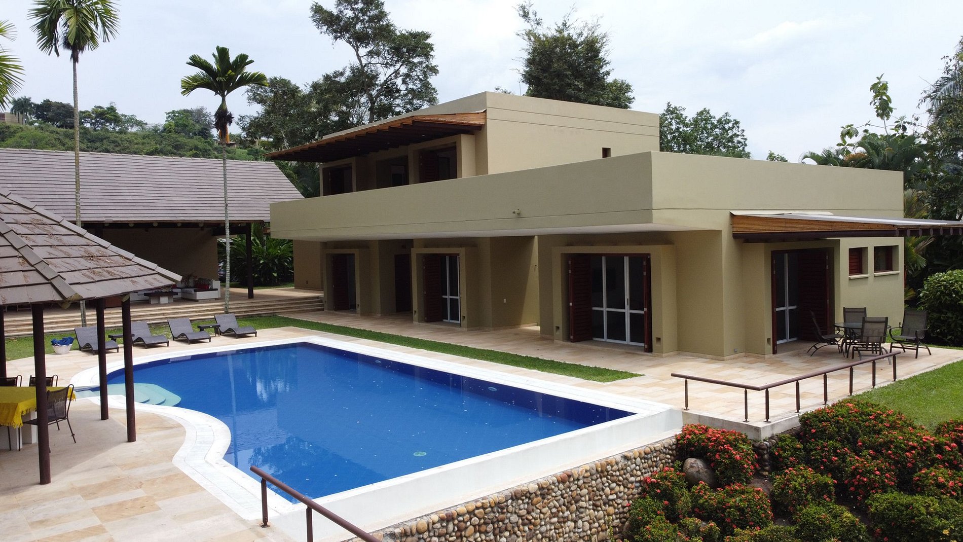 The view from the pool goes straight to the mountains of the region, with diverse and beautiful flora. The large stone deck surrounding the pool and jacuzzi takes guests on a stroll through the garden's flowers to the property's interiors.