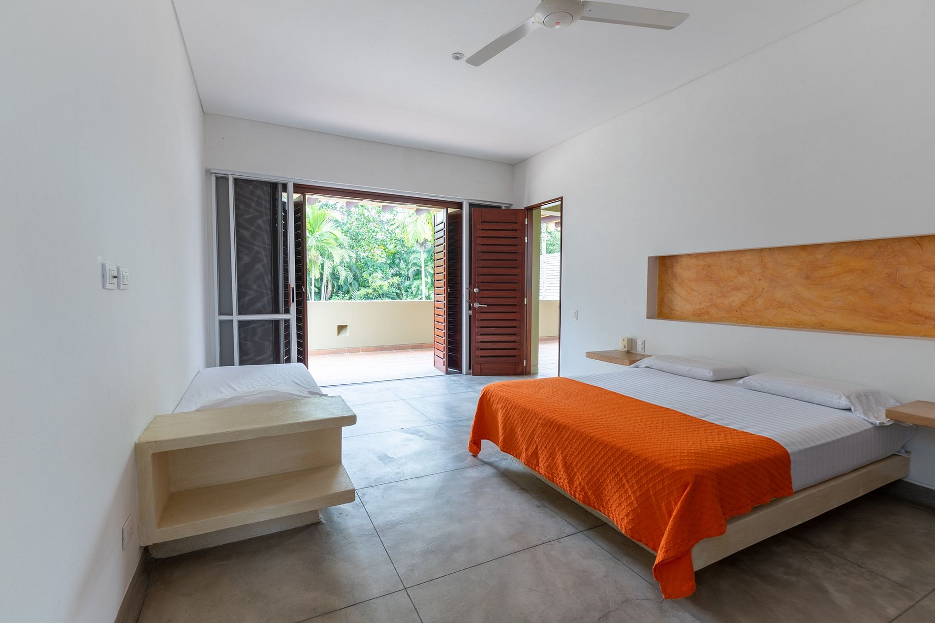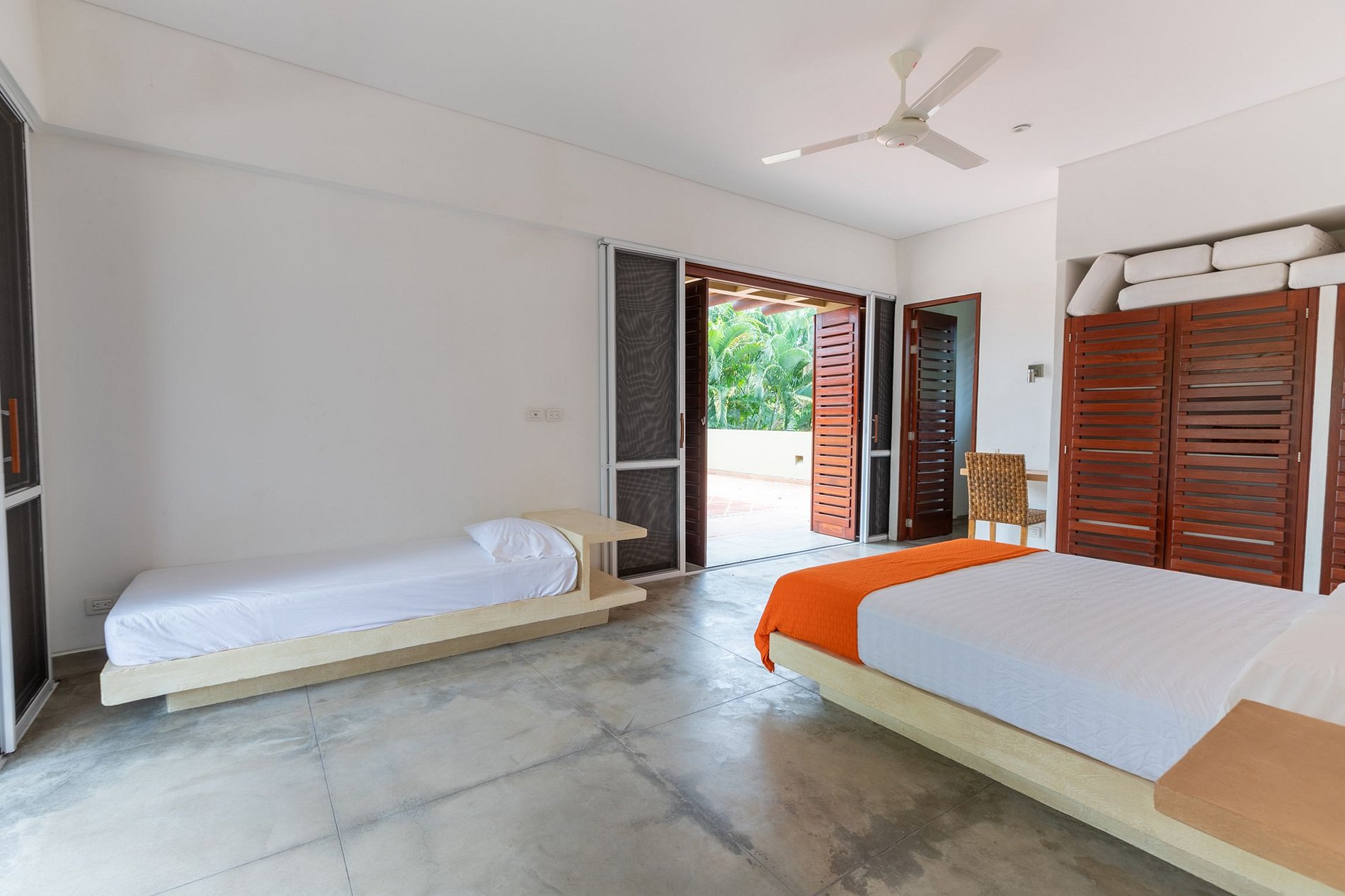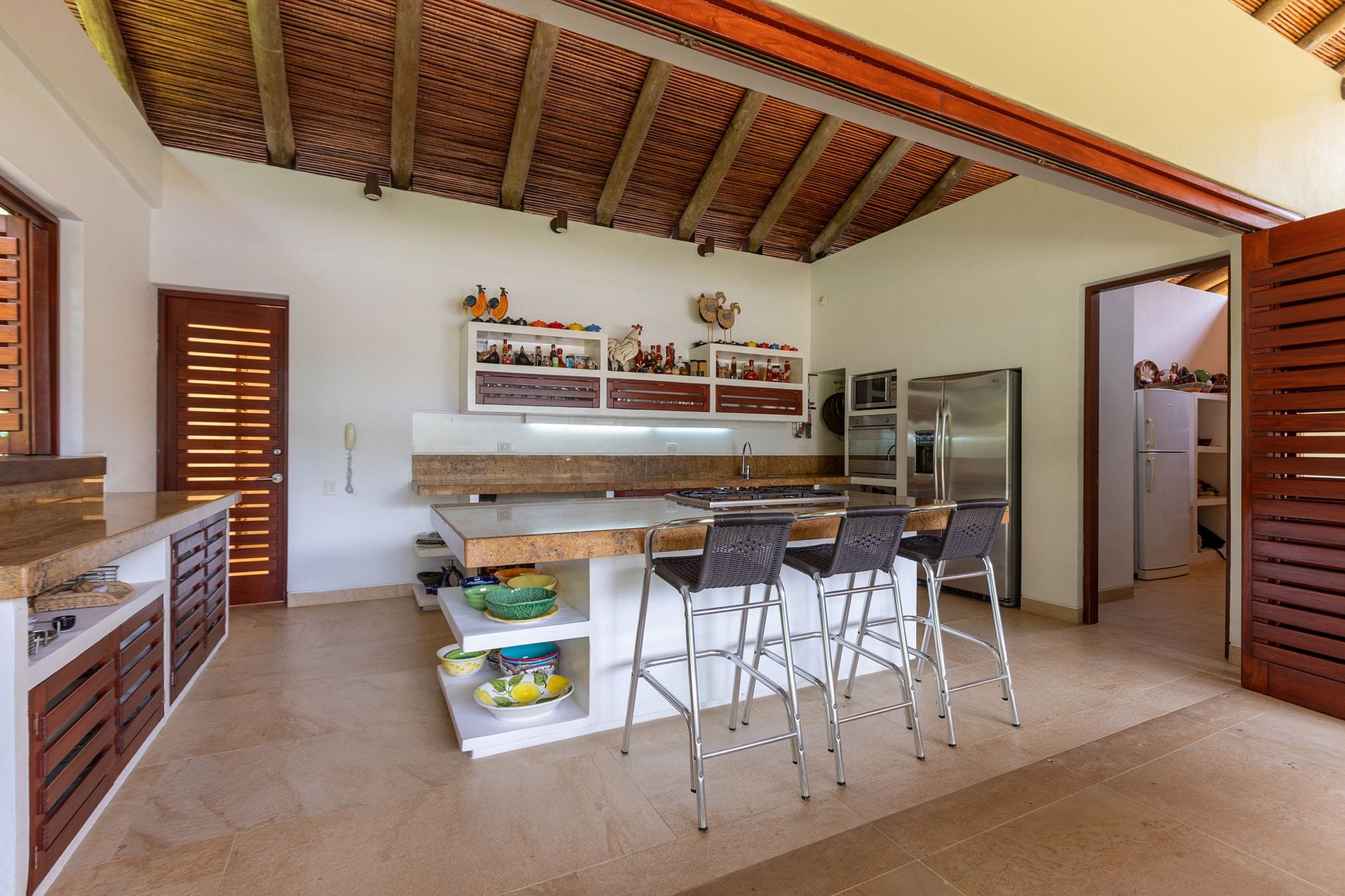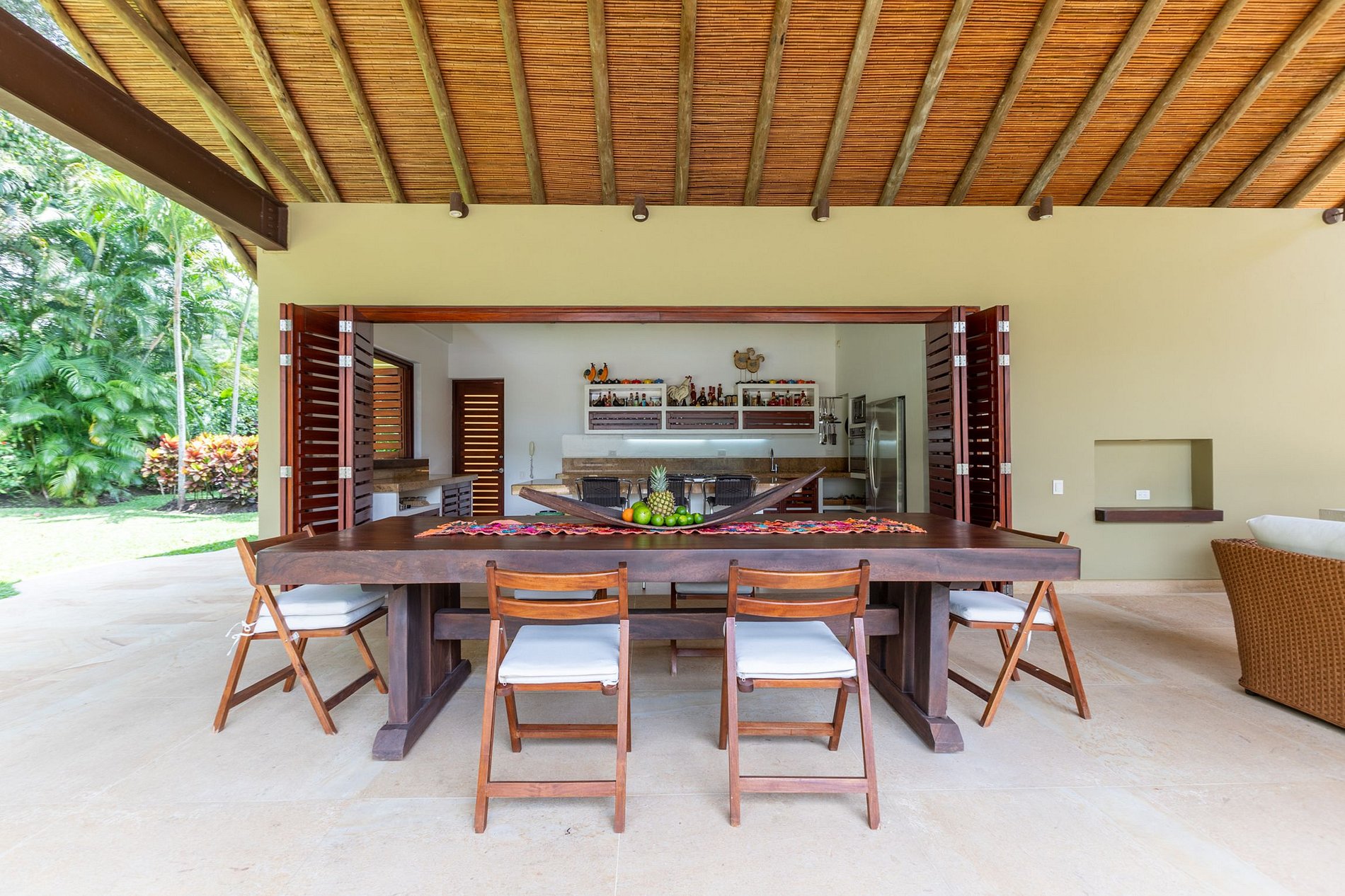The gourmet kitchen connects and opens completely onto the balcony that leads to the dining area, with a large wooden table. The upper floor, where two of the suites are located, has a large terrace that provides a panoramic view of all the local flora.