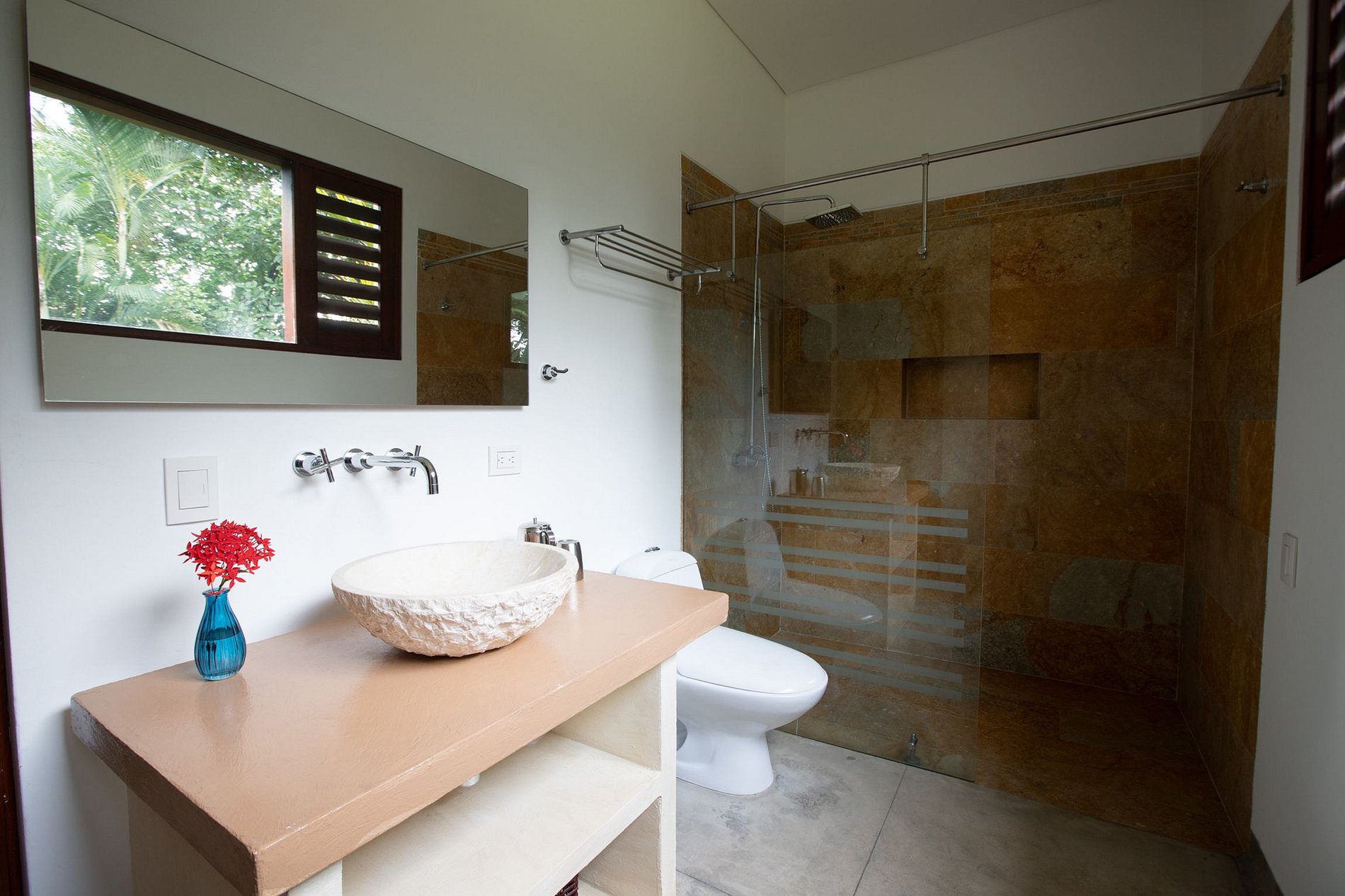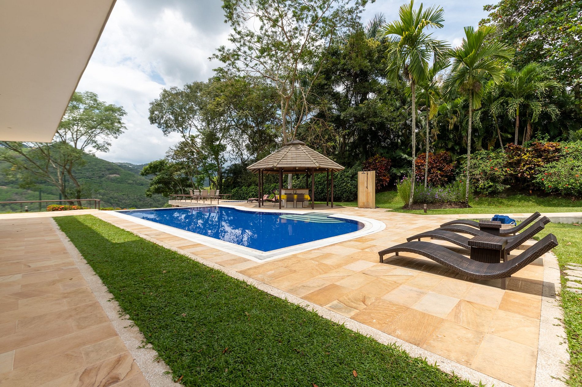 The view from the pool goes straight to the mountains of the region, with diverse and beautiful flora. The large stone deck surrounding the pool and jacuzzi takes guests on a stroll through the garden's flowers to the property's interiors.