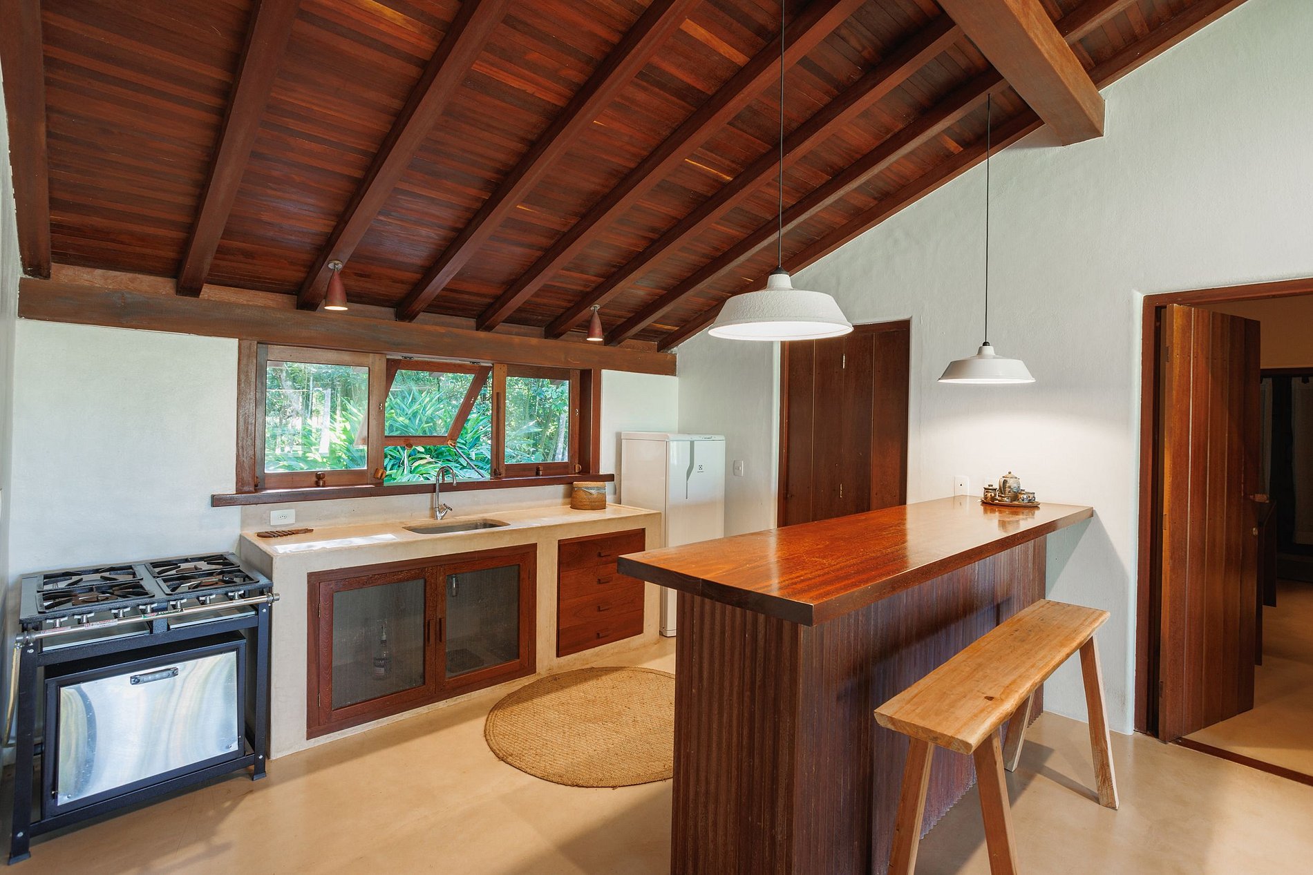 The main living room and dining room have glass doors that open onto a balcony followed by a large wooden deck with a huge solarium sofa. The house surrounds an open courtyard with grass and coconut trees. From the main deck there is a staircase that goes down to the lawn and another that goes up to a viewpoint covered by a piassava, where there is a sofa, armchairs and a bar whose view encompasses the sea from Praia dos Coqueiros (north side) to Ponta de Itapororoca (South side).