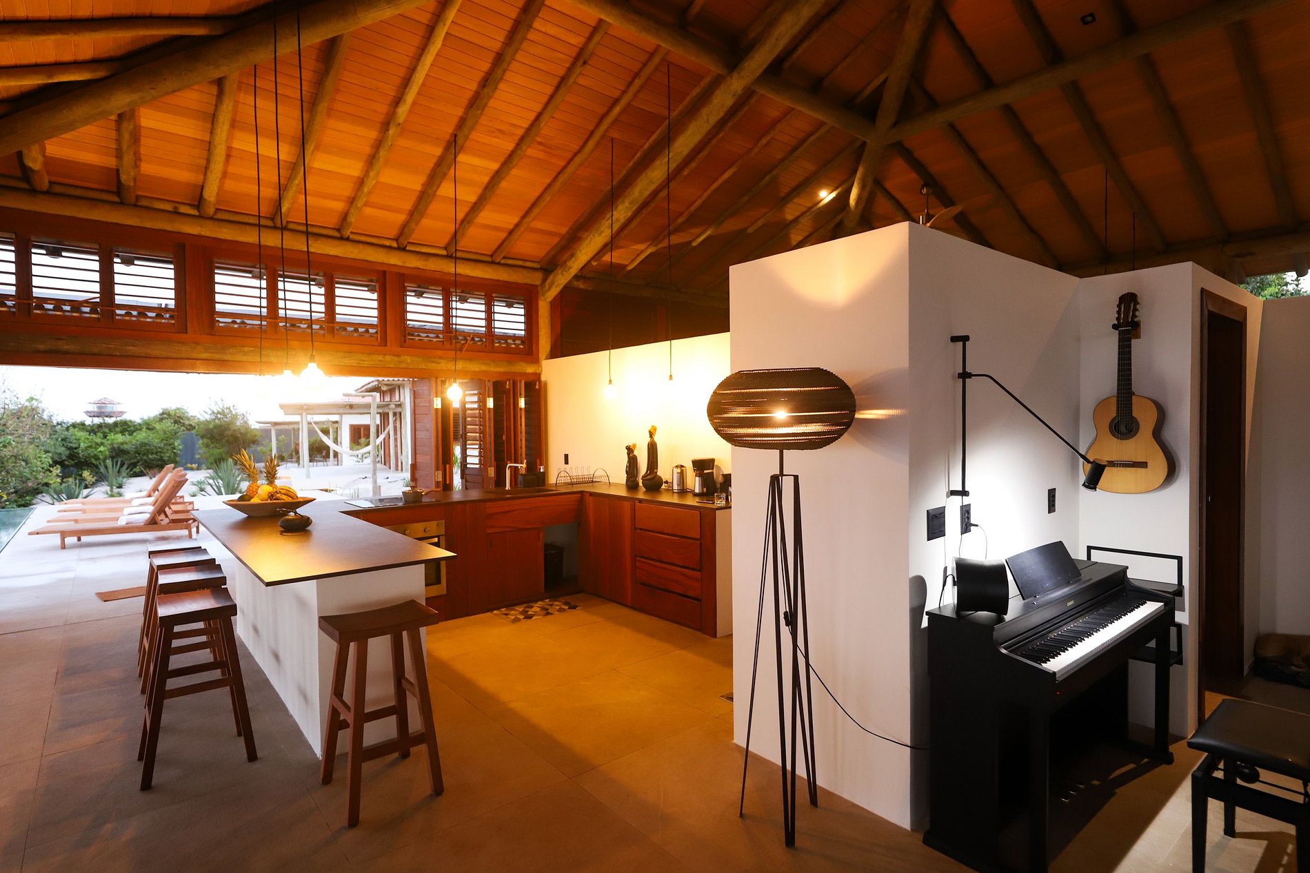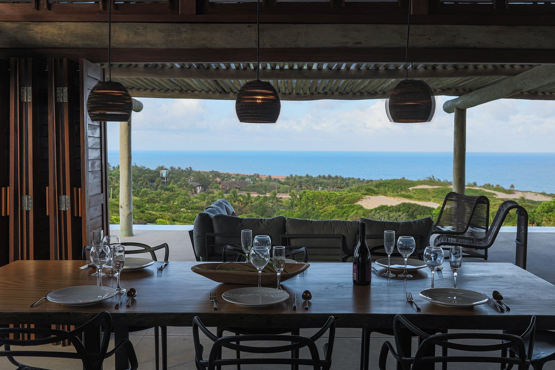 Discover a laid-back luxury retreat in stunning Pipa, with 360-degree panoramic views capturing the ocean and vegetation of Northeastern Brazil. At the center of the property, a stunning infinity pool stands out, surrounded by a large outdoor deck with wooden loungers, ideal for enjoying the sun or enchanting sunsets.