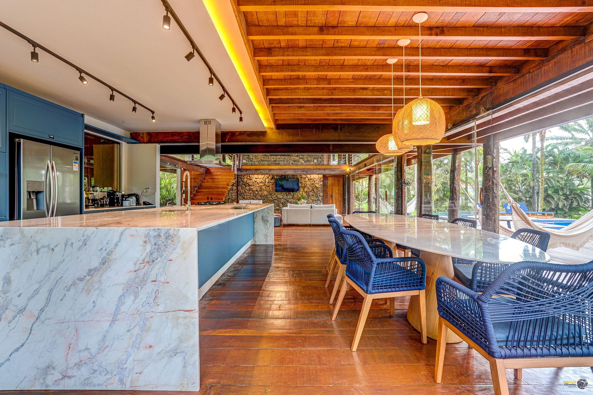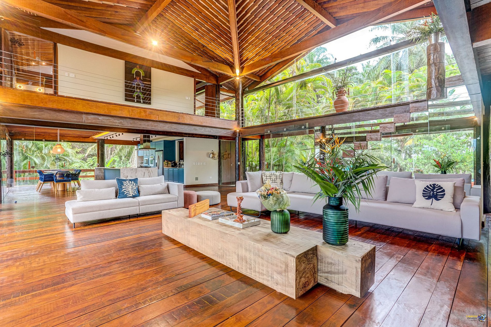 The villa was built with an open concept design in mind. On its first floor, what stands out is its large living room, furnished with custom furniture and decorated with local architecture.