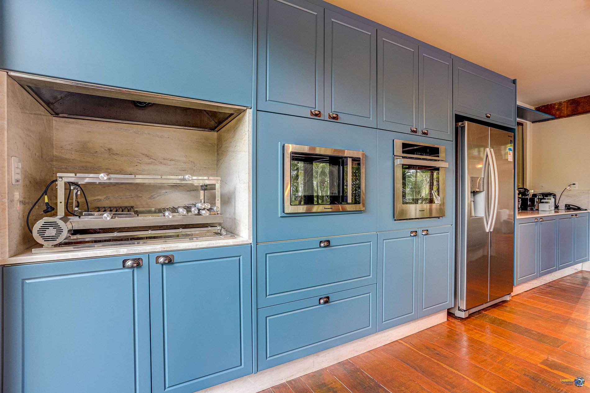 The second setting that stands out is its beautiful kitchen equipped with modern appliances and decorated with beautiful furniture and counters in sky blue that convey peace and joy when preparing tasty meals in this place, whether on the stove or on the barbecue.