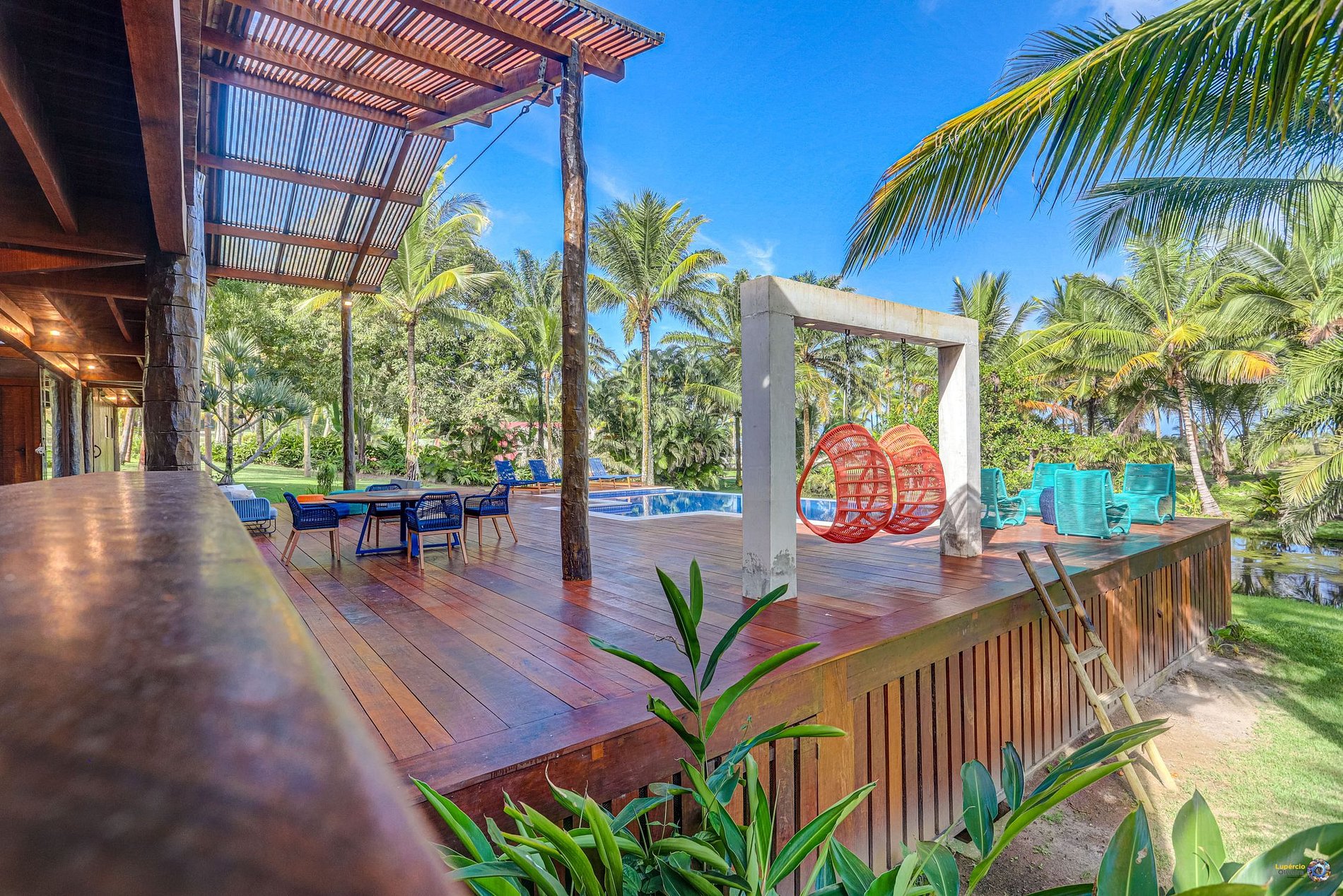 On the villa's balcony is the outdoor living area with sofas and a dining table. Its charming pool is the highlight of the villa, located on the wooden deck : it is excellent for cooling off on hot days, its sun loungers are perfect for resting in the sunlight and sunbathing while contemplating the pleasant view of the area.