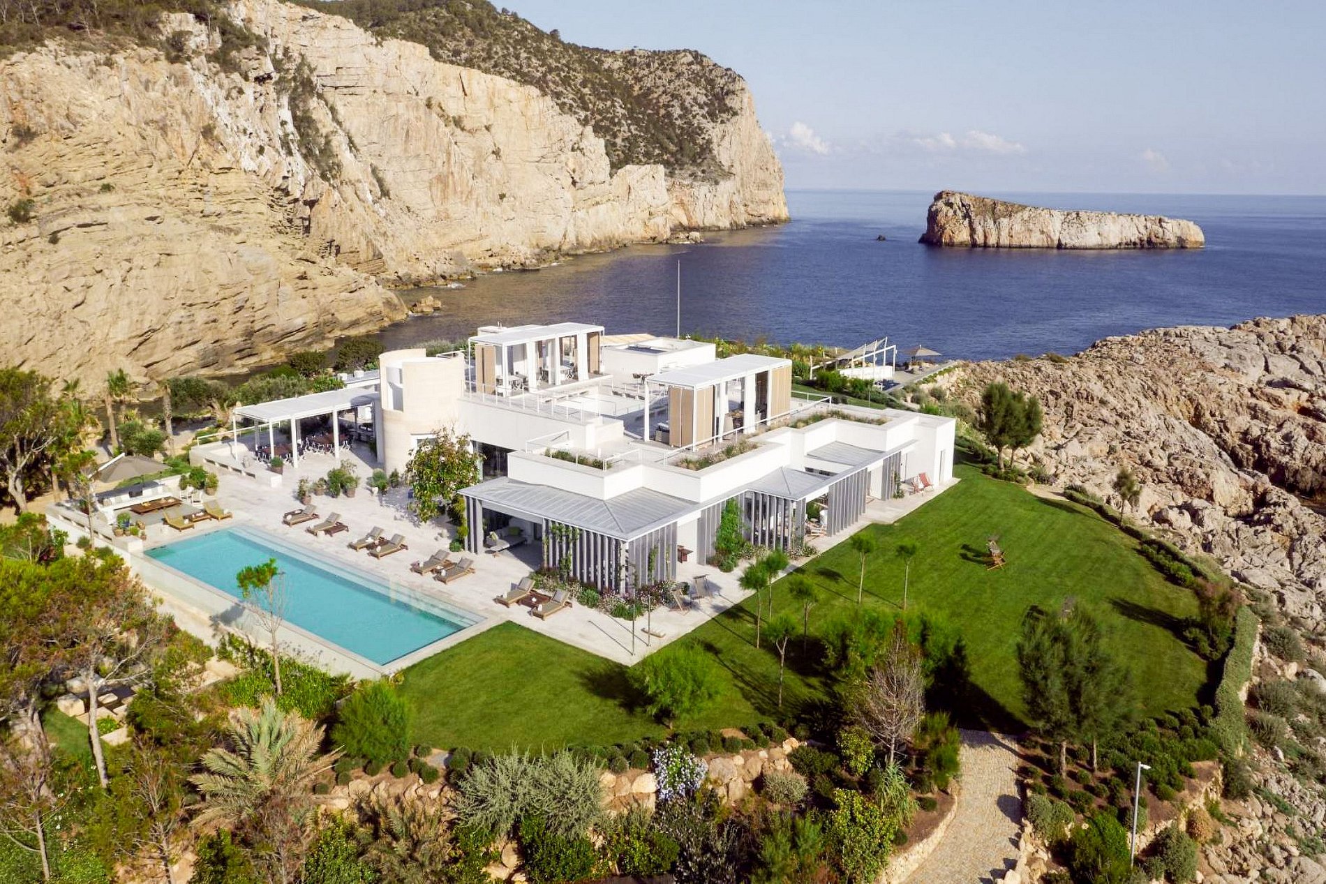 Discover an unparalleled retreat on a 35,000-square-meter private island nestled in the enchanting Bay of San Miguel, Ibiza. This ultra-luxury villa, meticulously refurbished, serves as the quintessential sanctuary for an extended family vacation, a reunion of friends, or a distinguished event.