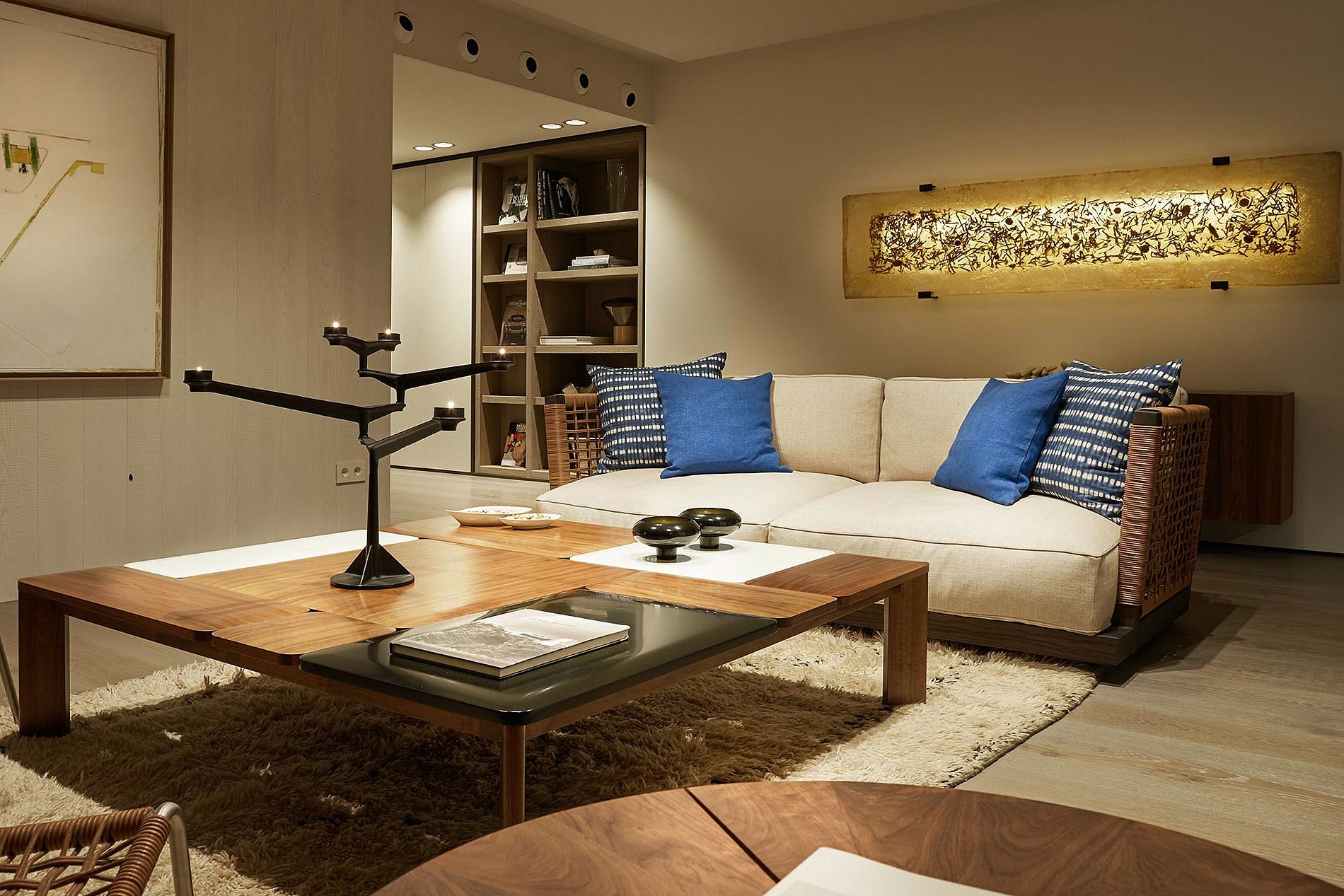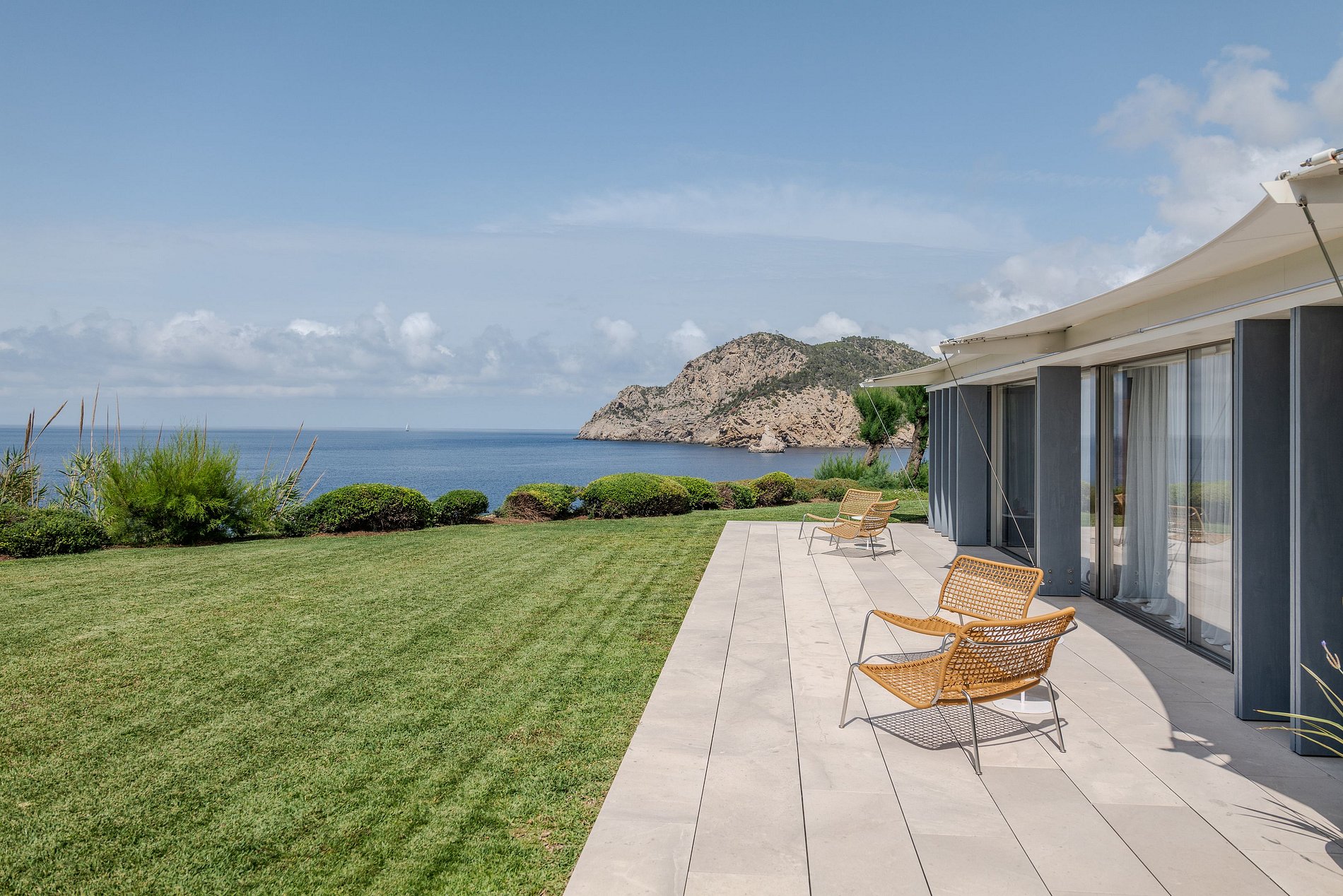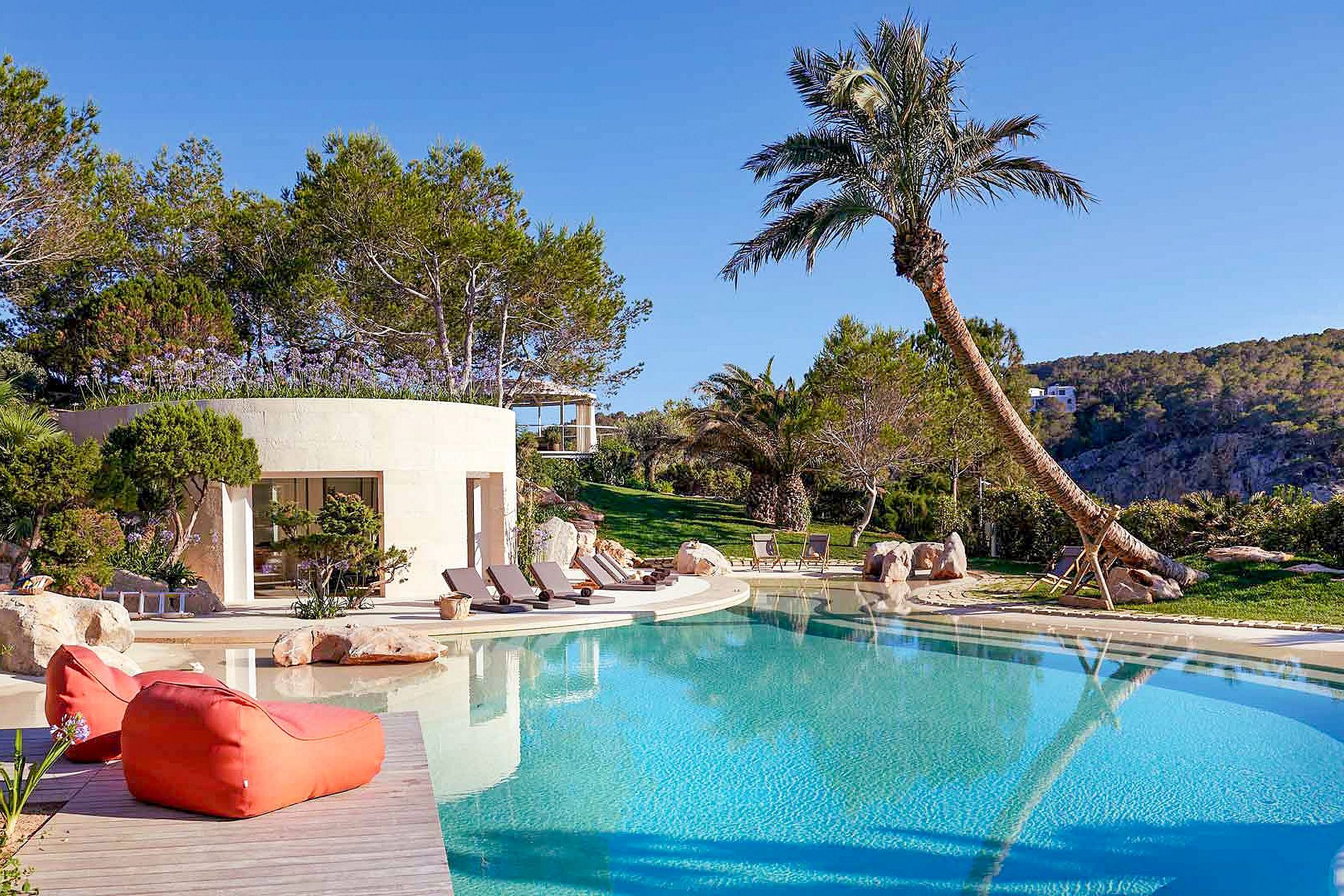 Inside, the villa exudes a serene Ibizan vibe with its cool, airy spaces dressed in warm, natural textures, neutral tones, and curated local art, embodying the island's laid-back essence. The heart of the villa, a spacious central patio, is encircled by three elegantly appointed living rooms and a dining room, all adorned in a chic Balearic style. Floor-to-ceiling windows retract seamlessly into the walls, merging indoor elegance with outdoor allure across various terraces, offering bars, serene chill-out areas, and open-air dining options.