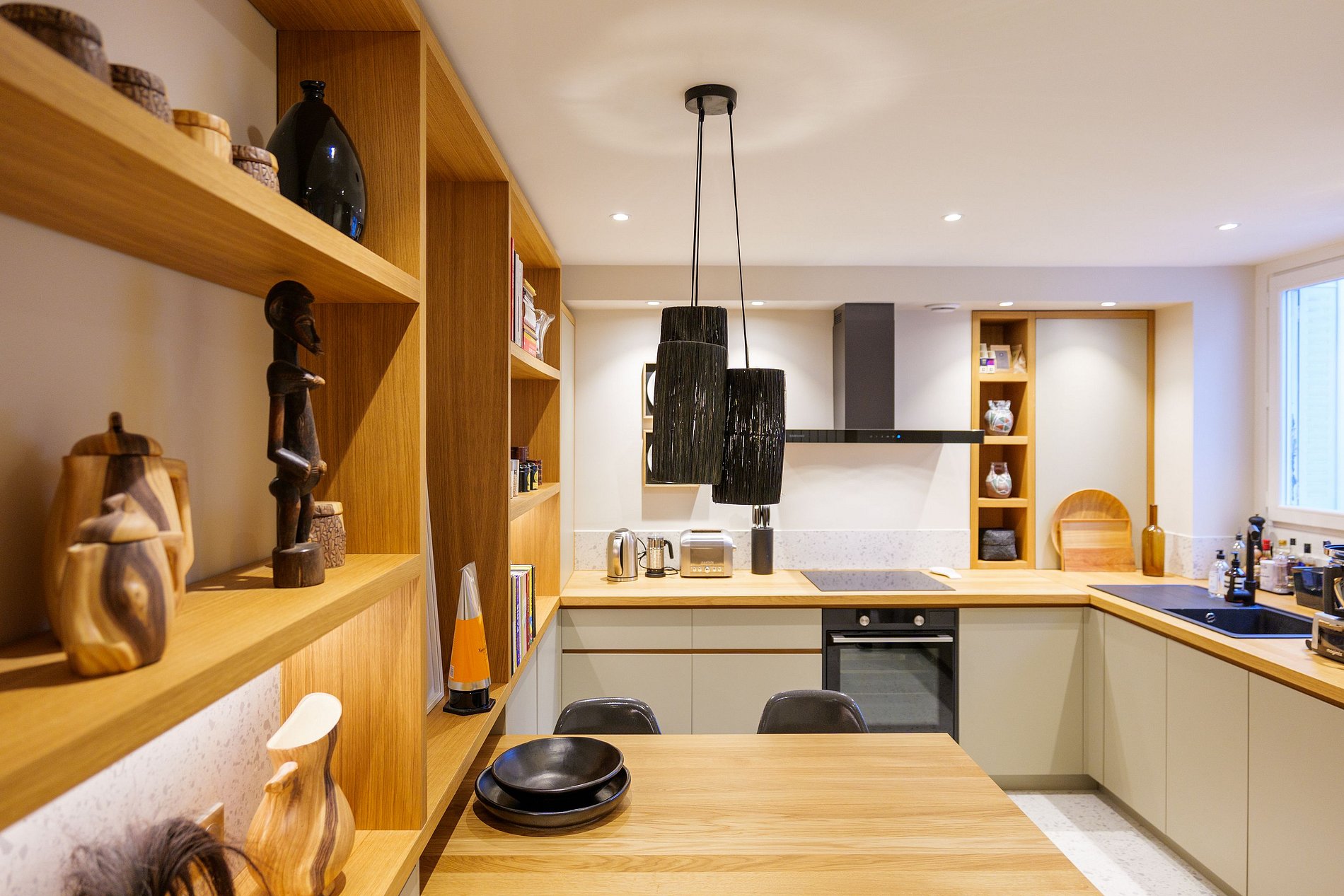 The apartment features comfortable living areas, including a cozy lounge where you can unwind after a busy day exploring the city. Adjacent to the lounge is a dining area with a table for six, perfect for enjoying meals with friends and family. The kitchen is fully equipped with modern appliances, making it a delight for culinary enthusiasts to whip up delicious meals.