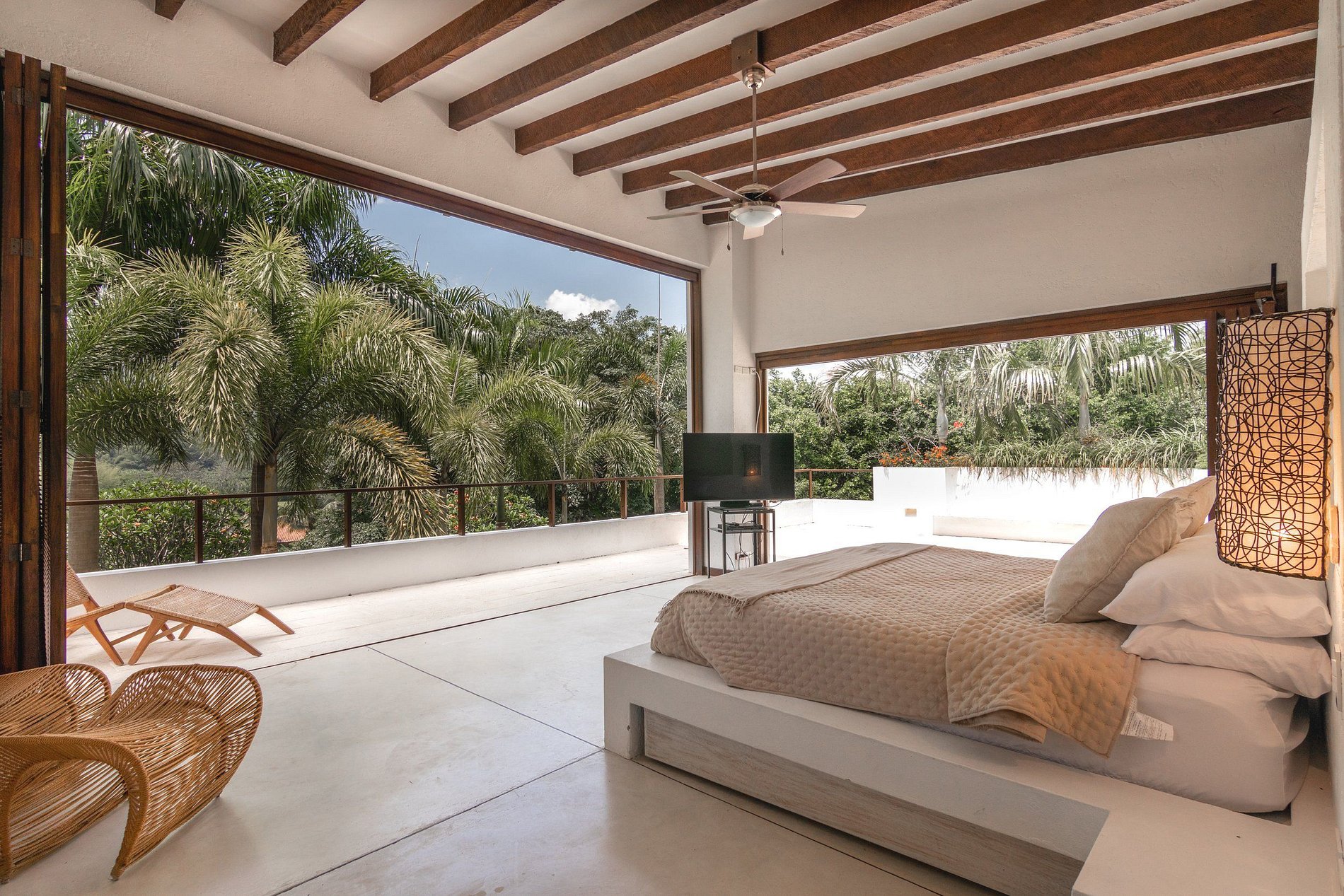 Experience rustic elegance amidst lush greenery and vibrant vegetation. Each of the five comfortable bedrooms, with its own en-suite bathroom, opens onto a grassy, palm-studded garden. The seamless integration of the open-concept kitchen and living room with the infinity pool and jacuzzi, adorned with sun loungers and hammocks, creates the perfect setting for afternoon siestas. Disconnect from the world's noise and tune into your own rhythm with the built-in sound system.
