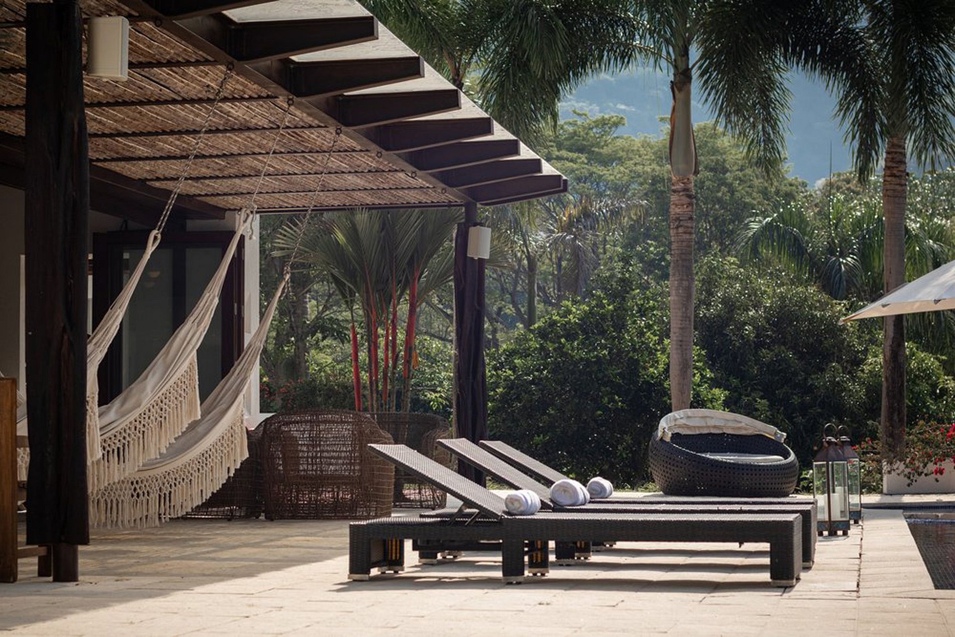 Experience rustic elegance amidst lush greenery and vibrant vegetation. Each of the five comfortable bedrooms, with its own en-suite bathroom, opens onto a grassy, palm-studded garden. The seamless integration of the open-concept kitchen and living room with the infinity pool and jacuzzi, adorned with sun loungers and hammocks, creates the perfect setting for afternoon siestas. Disconnect from the world's noise and tune into your own rhythm with the built-in sound system.
