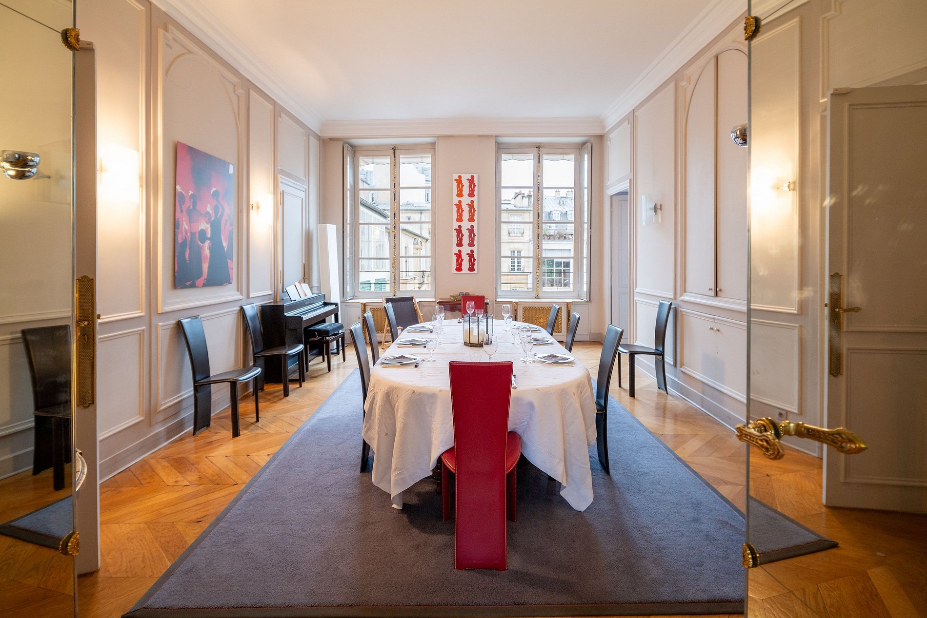 Upon entering the apartment, one is immediately welcomed by large living areas that exude elegance and comfort. The lounge area, with its spacious and open design, serves as the perfect setting for relaxation and entertainment, offering stunning views of the Seine River that can be enjoyed from the comfort of your home. Adjacent to the lounge, the dining room presents an ideal space for hosting memorable dinners, where guests can dine against the backdrop of Le Louvre's majestic architecture.