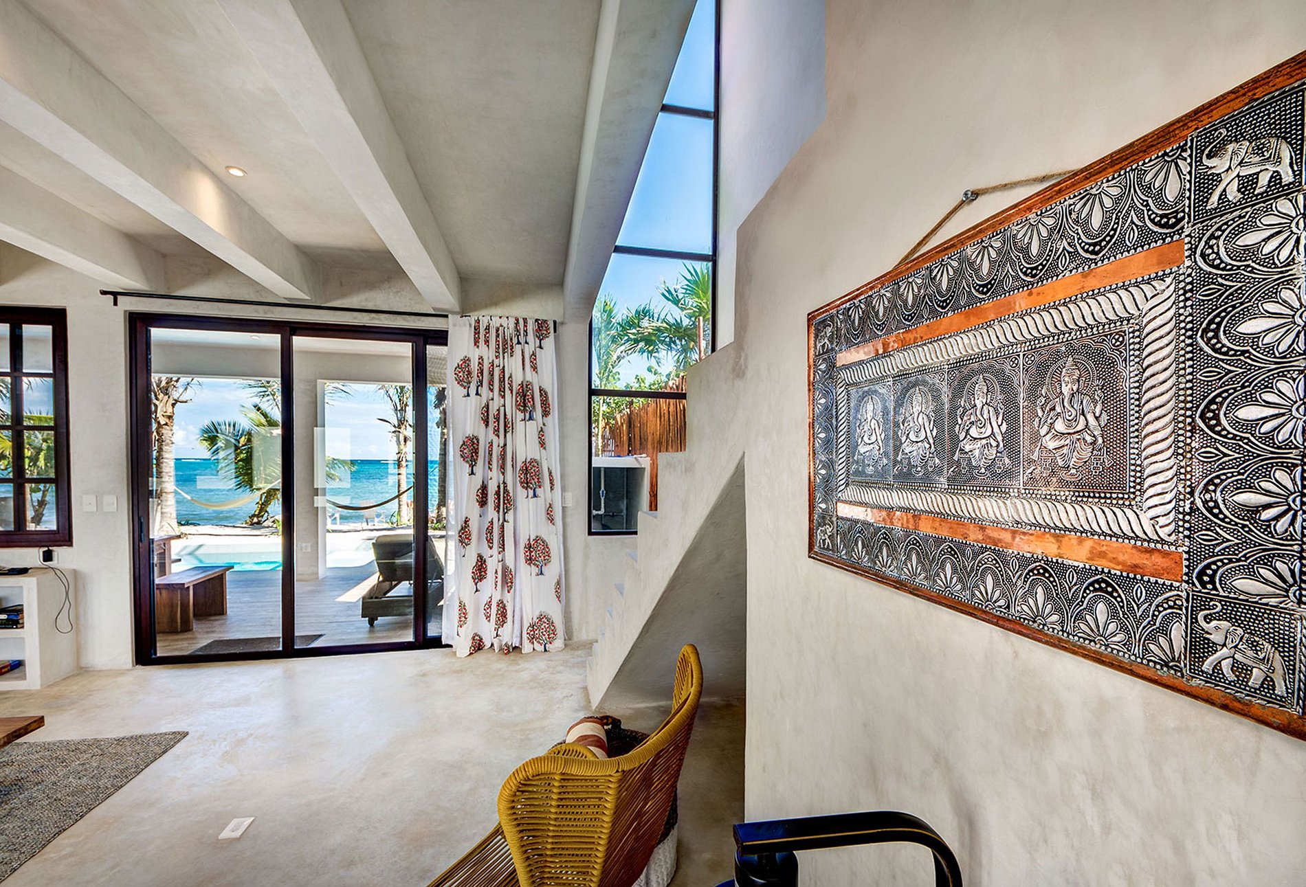 As you step into this grandiose villa through a wide landscaped entry, you get a sense of spaciousness as you see straight through the house to the sea. The main floor presents a large living room, dining room, and kitchen area that opens up via sliding panoramic doors to allow for an indoor/outdoor connection. As the indoor flows onto a large terrace, you gain additional space to dine poolside with a sea view. This area is wonderful for large groups and entertaining as it was intentionally designed for “group togetherness” and enjoying the company you’re with. The decor includes opulent fabrics and gorgeous wall hangings from India.