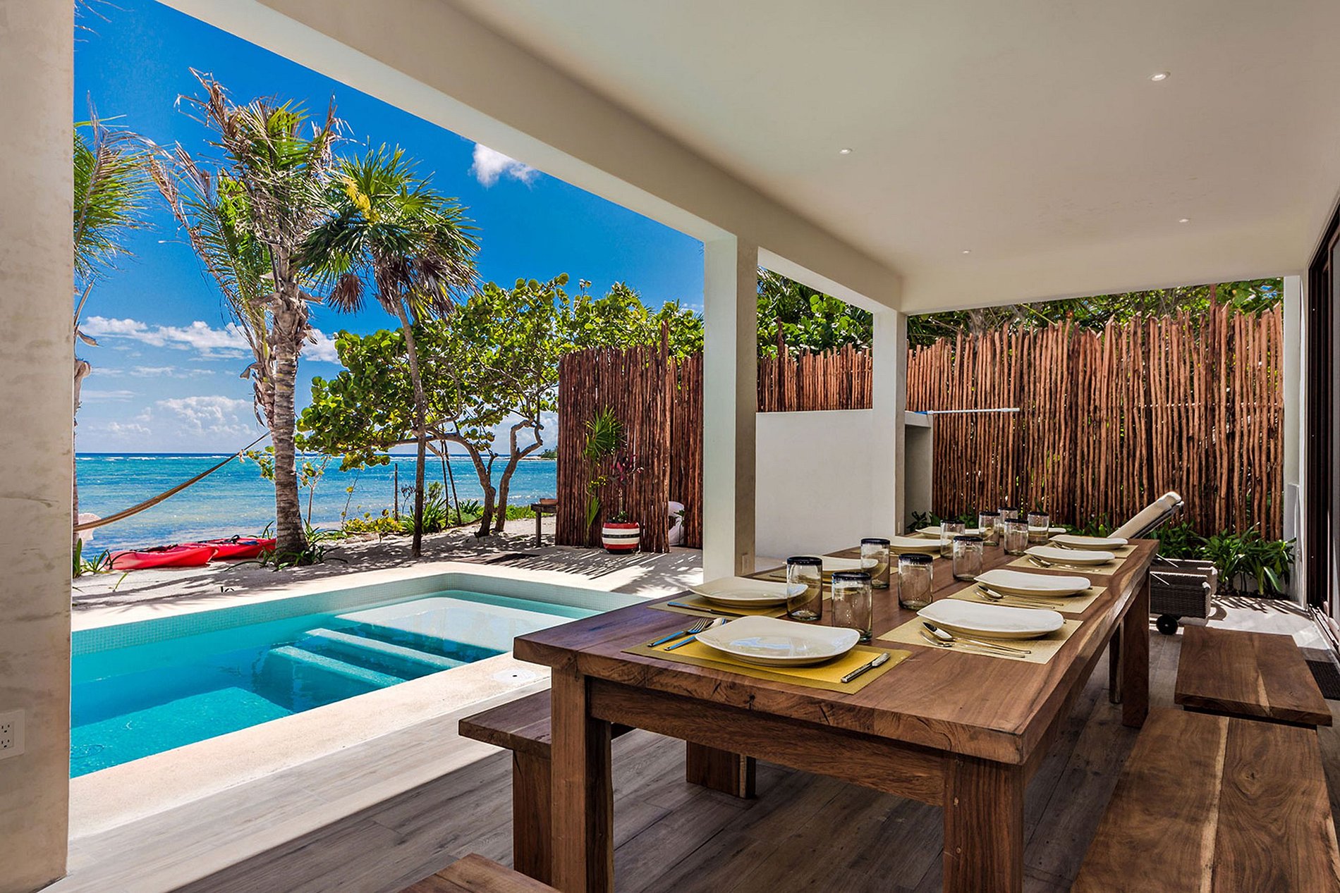Solimam Bay is an exclusive and gorgeous bay. Enjoy the warm waters of the Caribbean sea with Mesoamerican Reef nearby. The reef is only about a mile (1.6km) from shore and you can easily paddle, kayak, or swim out there to snorkel. Soliman Bay is also only a 10-minute drive to Tulum Pueblo (town) and the ruins. It is also not far from the other Mayan archaeological sites of Cobá and Chichén Itzá and only minutes north of Tulum’s beach hotspot with many restaurants, beach clubs, boutique shops, and more.