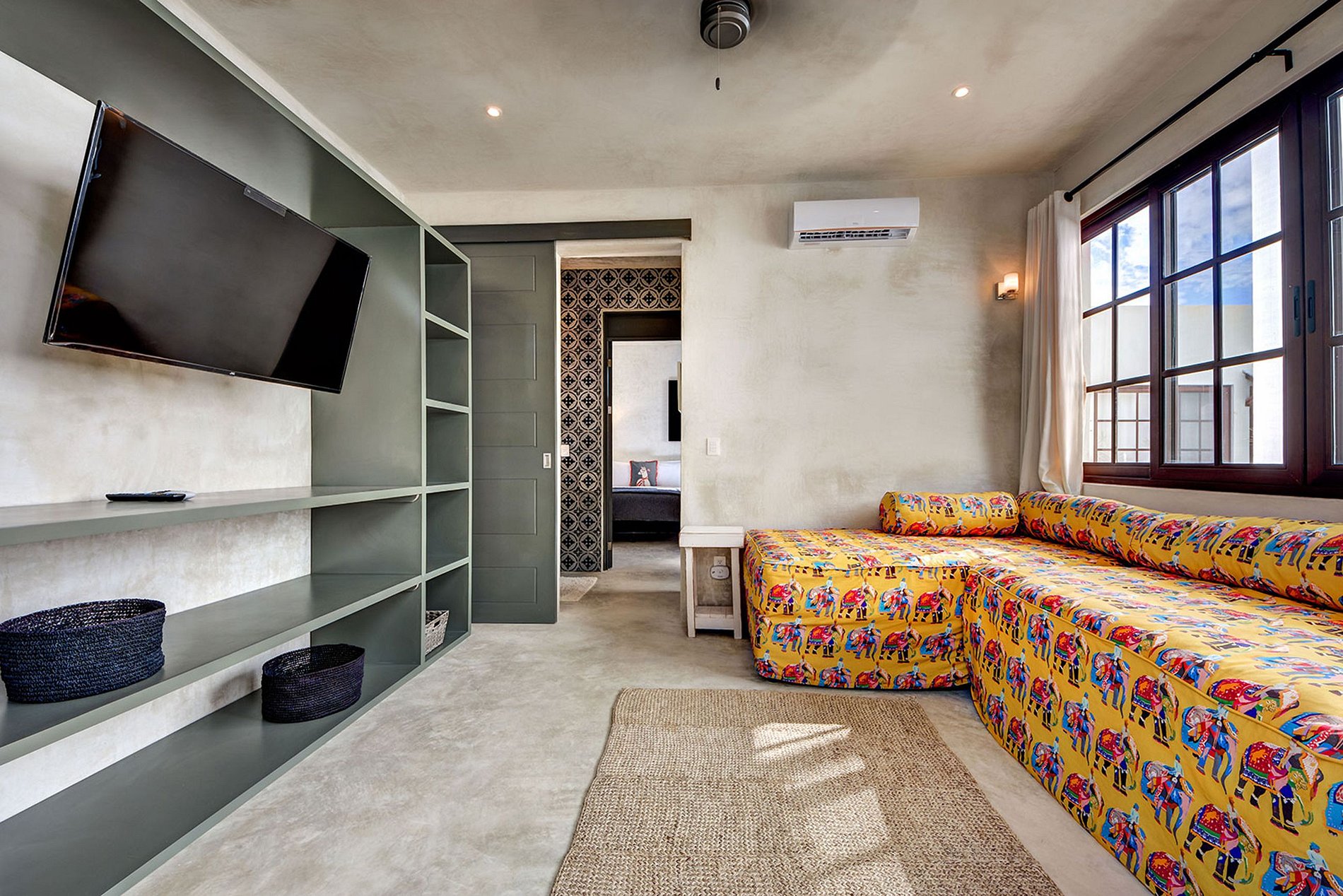 Head back through the courtyard and follow an eclectic water feature leading to a family room and bunkroom. Both have separate entrances with a connecting bathroom stunningly decorated with extraordinary handmade tiling. These rooms provide the most serenity of all the spaces in the home.