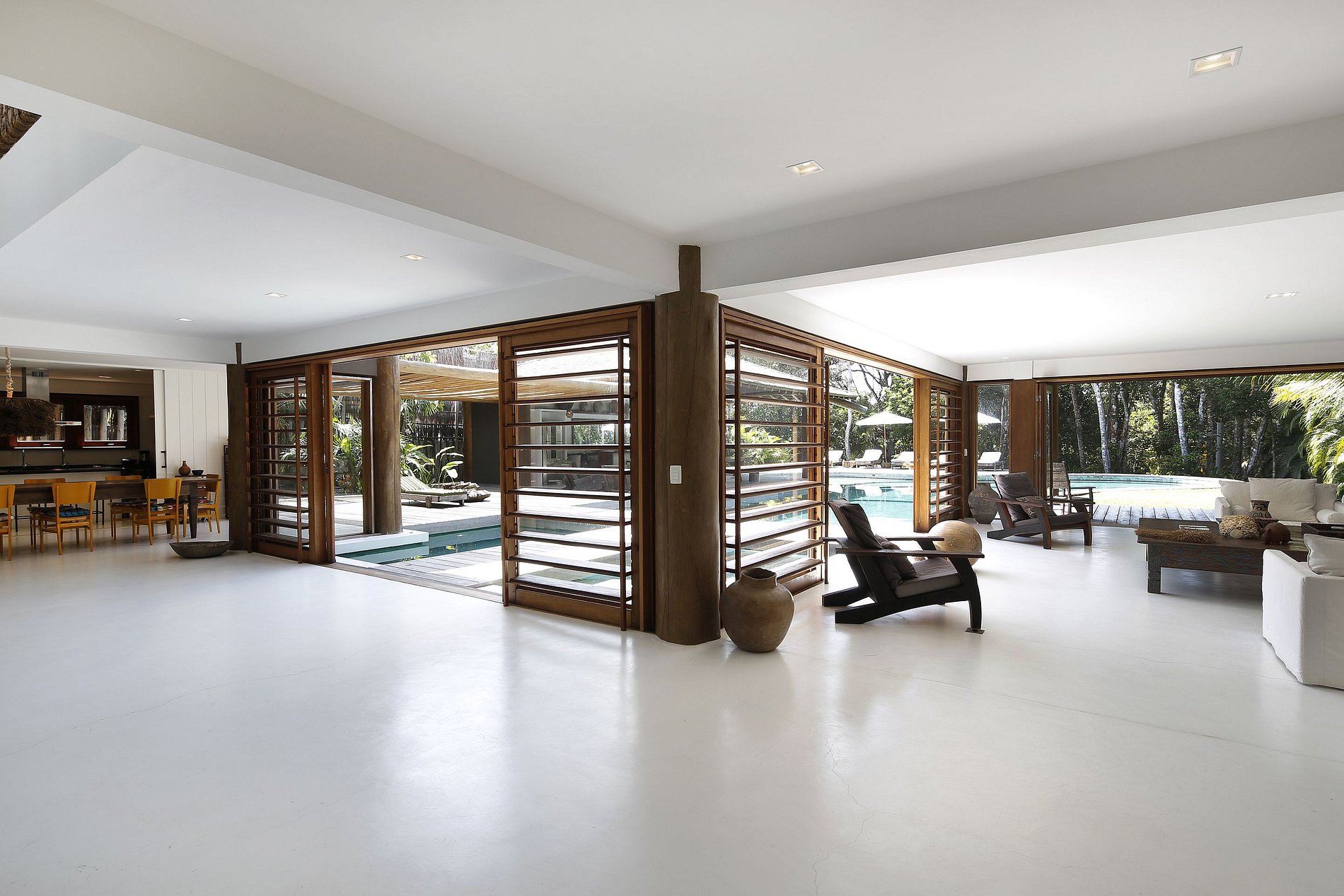 Discreet and classy bungalows, of good proportion, have a total of three more bedrooms with en-suite bathroom in total. The property is erected around a pool of subtle curves, with translucent water reflecting the golden light of the southern Bahia sun. Next to this magical pool, the vast gourmet area offers space and practicality to organize brunches, lunches, and dinners a stone's throw from the beach.