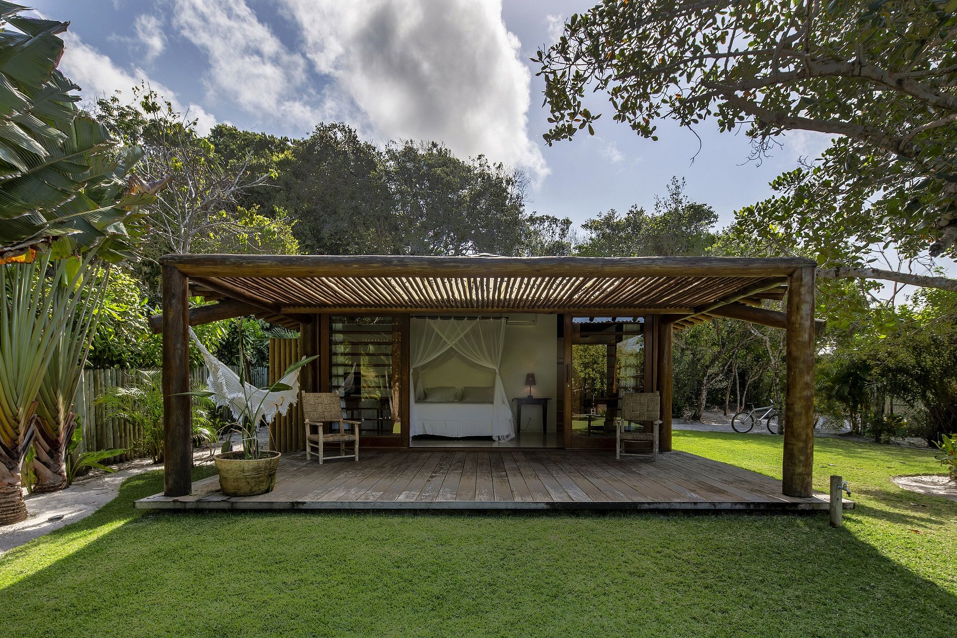 Discreet and classy bungalows, of good proportion, have a total of three more bedrooms with en-suite bathroom in total. The property is erected around a pool of subtle curves, with translucent water reflecting the golden light of the southern Bahia sun. Next to this magical pool, the vast gourmet area offers space and practicality to organize brunches, lunches, and dinners a stone's throw from the beach.