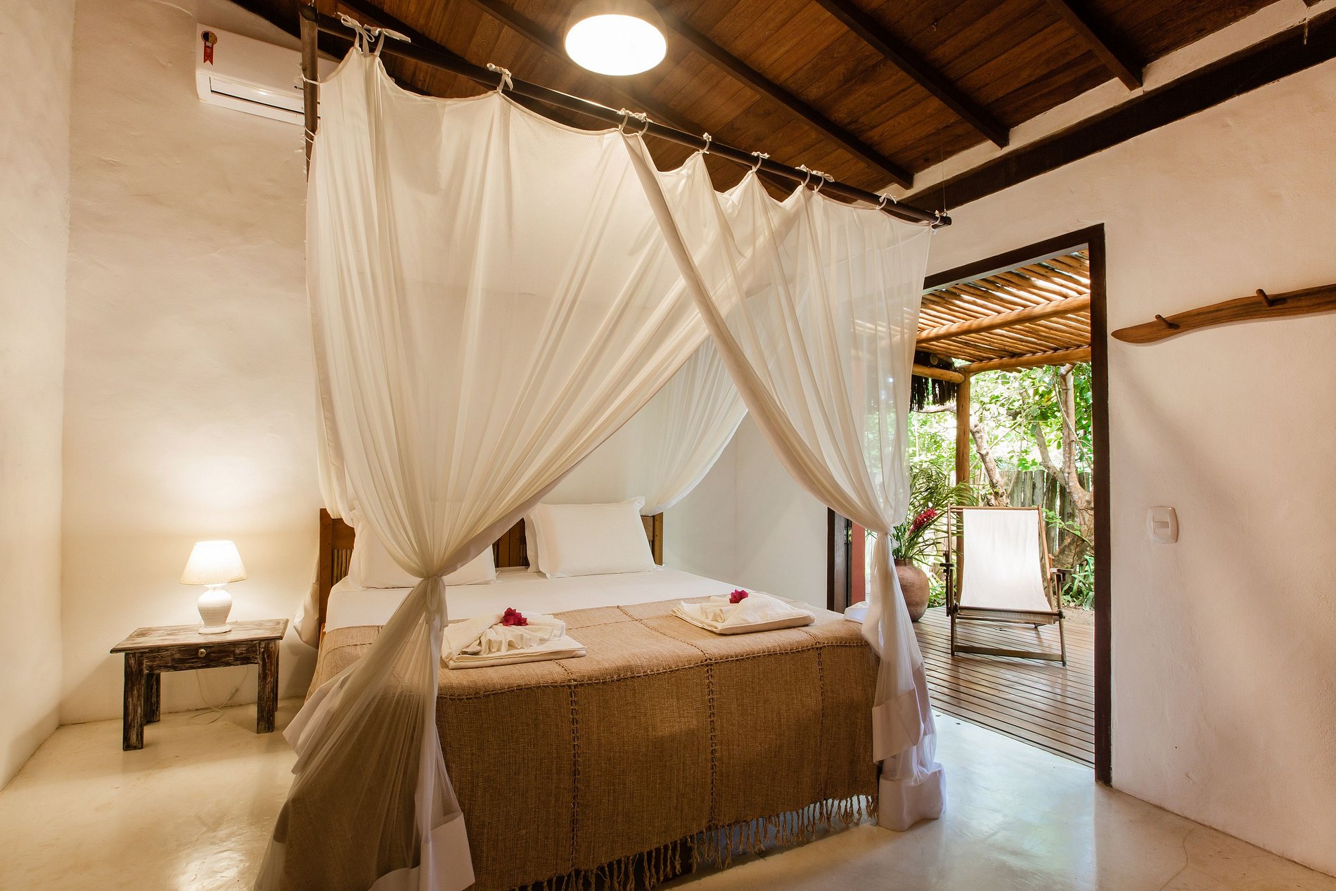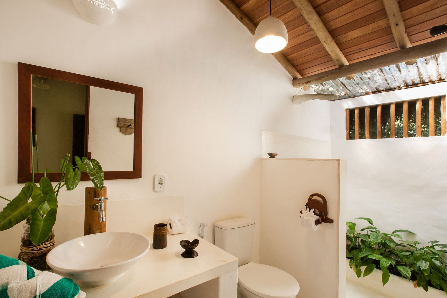 The main house has on the ground floor a social area, which ranges from the solarium overlooking the ocean, barbecue, balcony with chaises and hammocks, living room, a super cozy American pantry and the kitchen. There are two suites on the ground floor as well. Still in the main house, on the upper floor is the master suite with sea views.