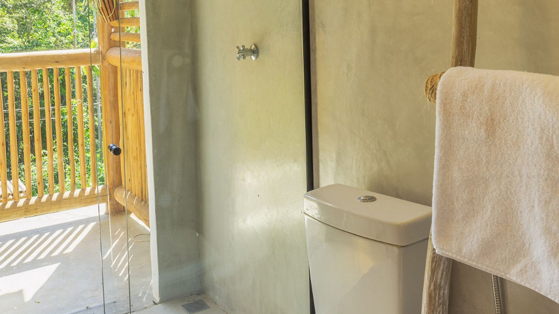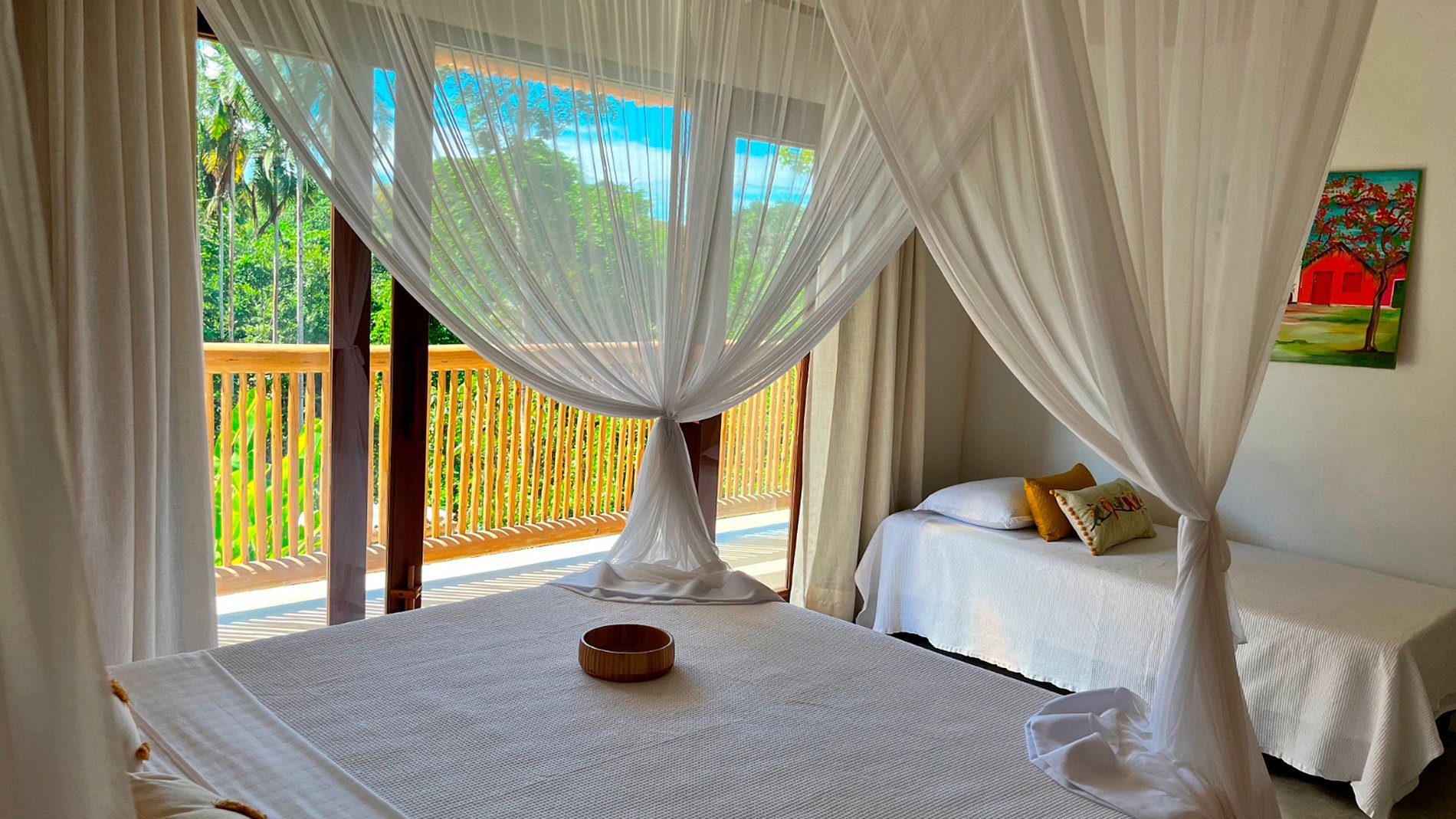 On the ground floor, one of the suites offers access to the house's back balcony and a jacuzzi, providing unparalleled moments of relaxation. On the second floor, the other two suites have stunning views, one towards the back of the house and the other towards the pool and preserved forest, creating a setting of serenity and natural beauty.