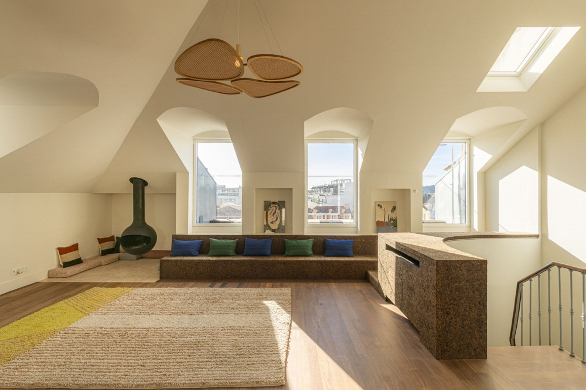 On the top floor, a large open attic space can be used as a multi-purpose room: yoga area, TV lounge, playroom or relaxation space. It is equipped with a suspended fireplace and modular seating.