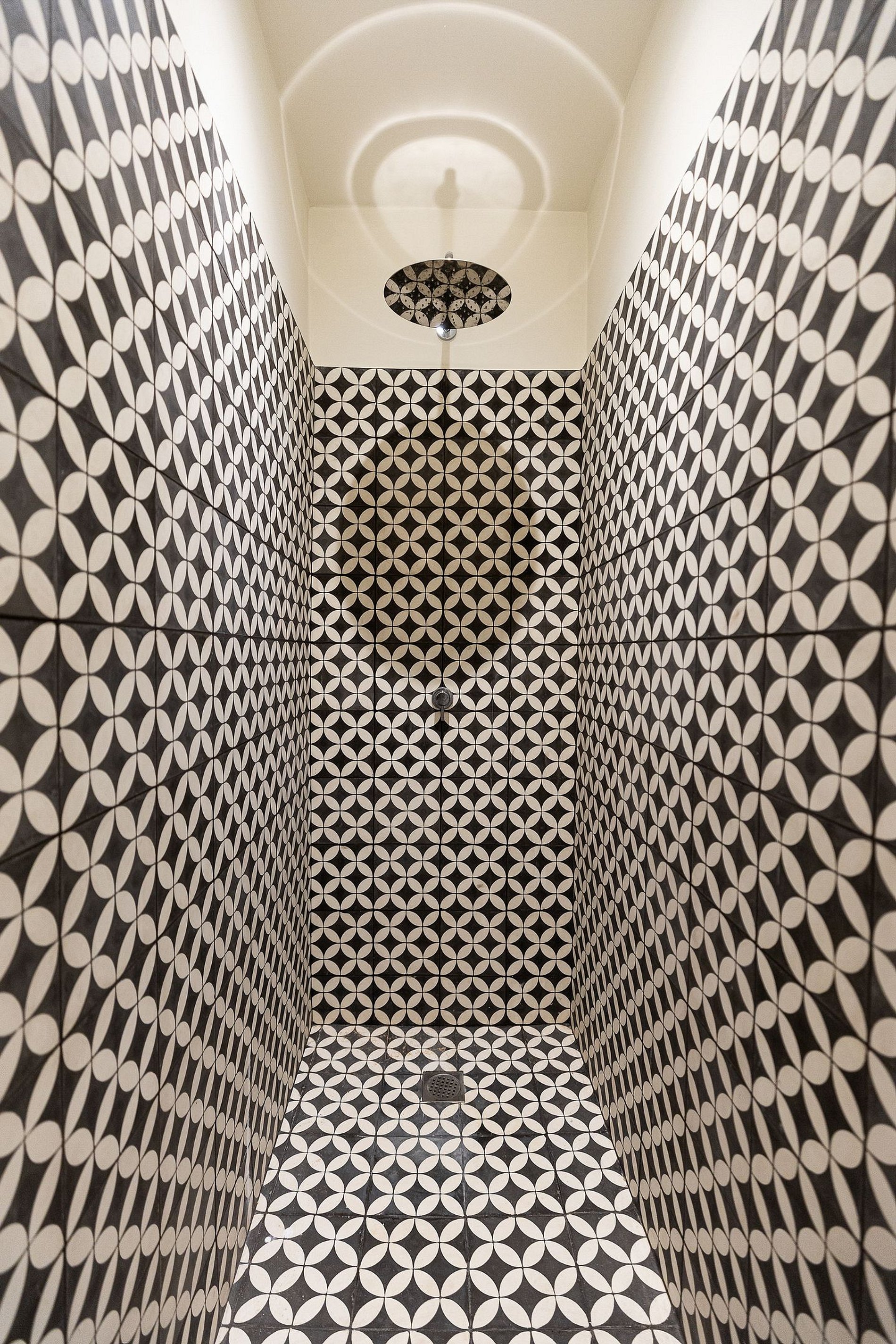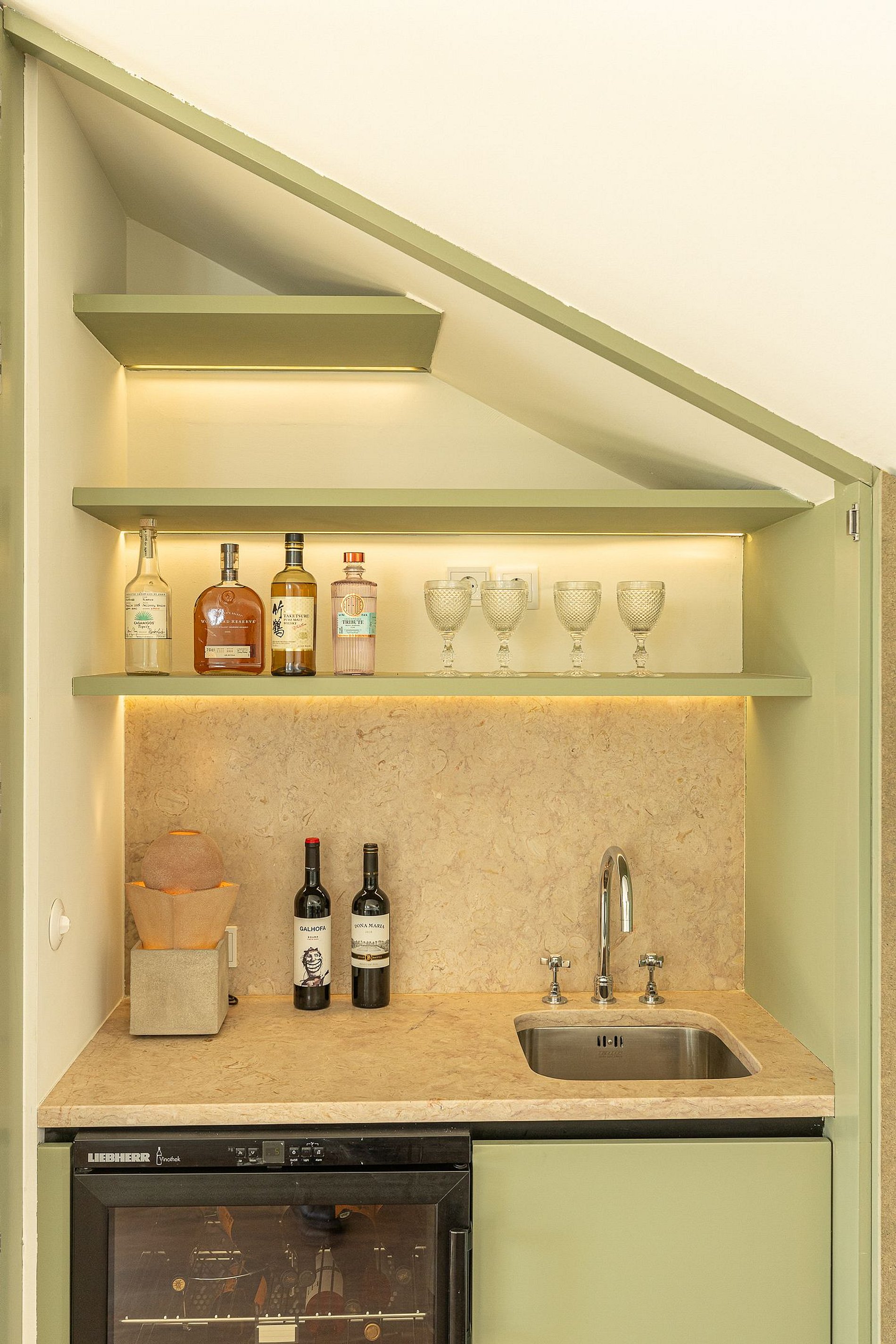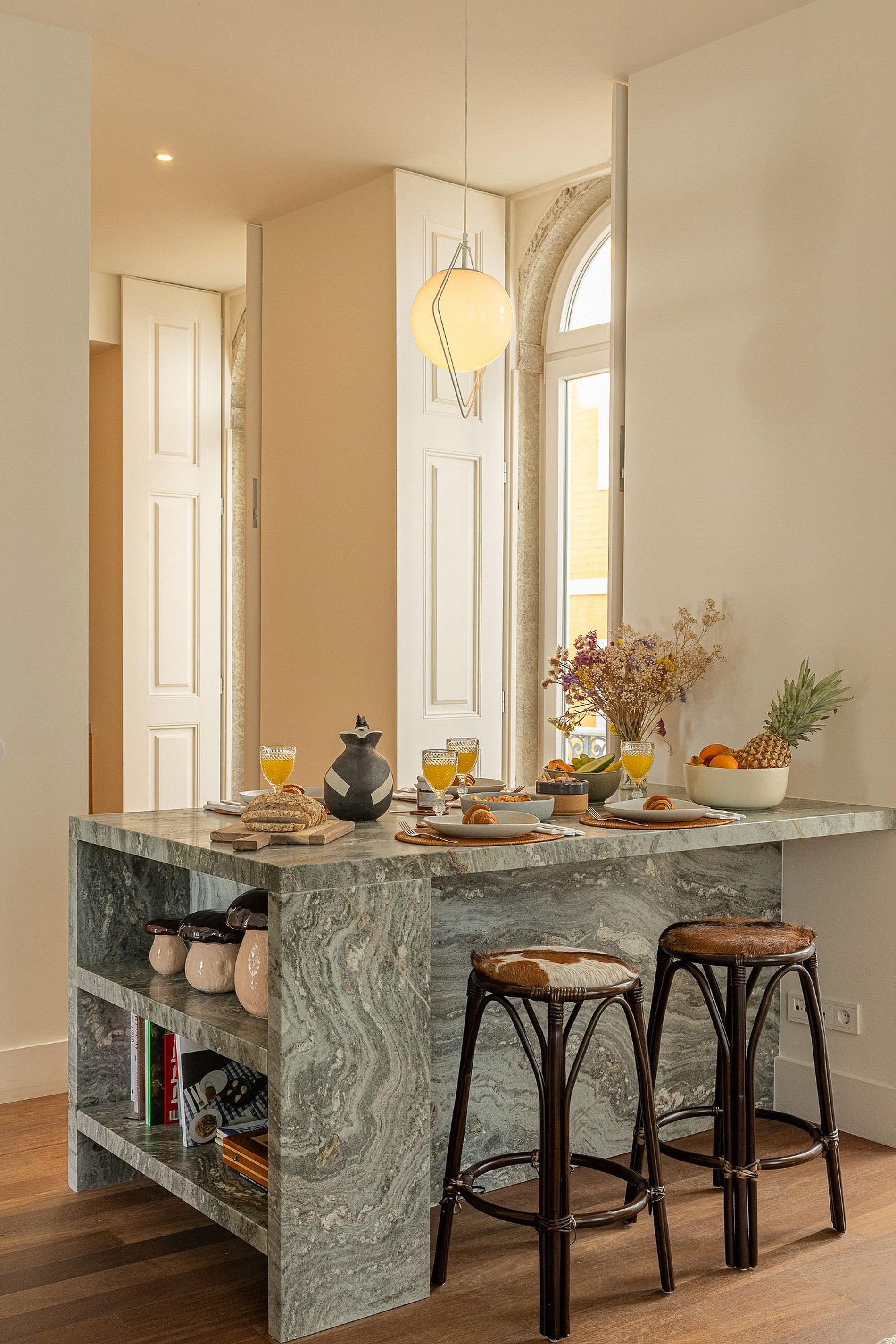 The kitchen and bathrooms feature marble finishes, combined with wood joinery, creating a cohesive and understated aesthetic.