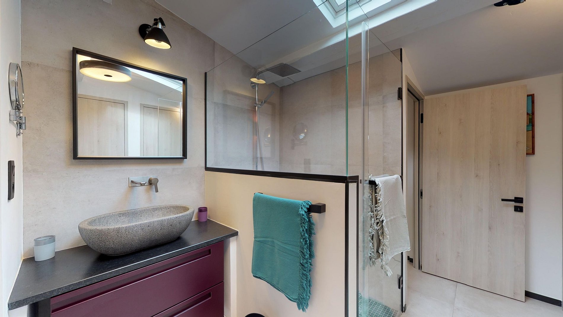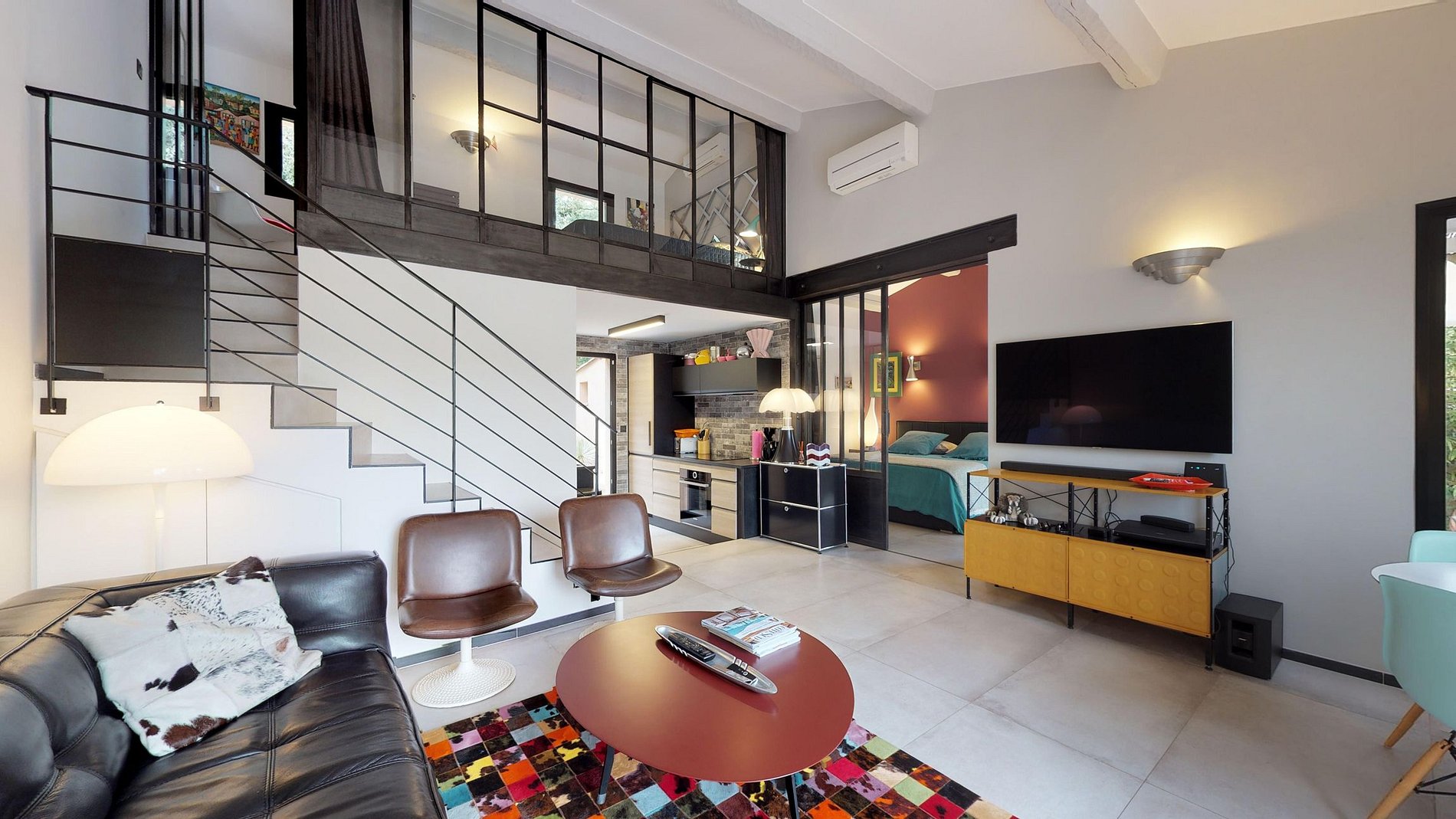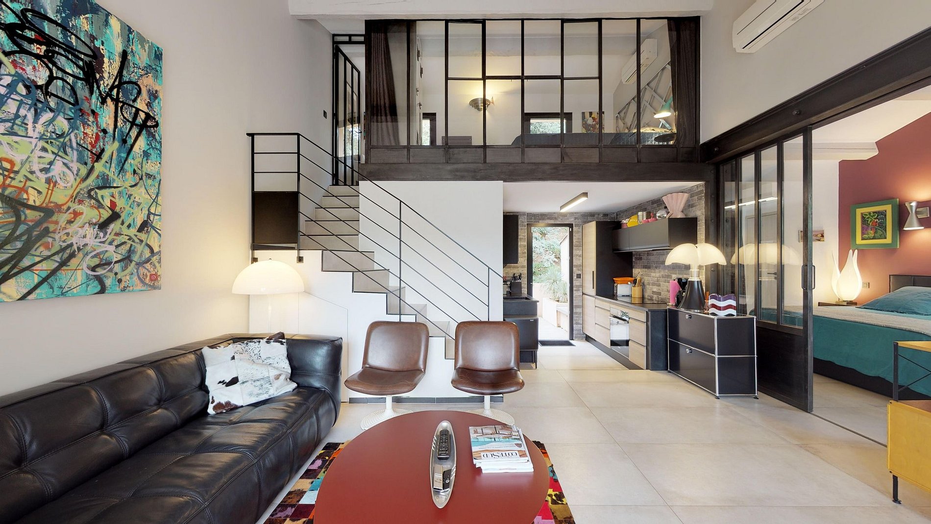 This loft includes two bedrooms, each open on the living room with glass windows, a fully equipped kitchen, a private pool and a barbecue area.