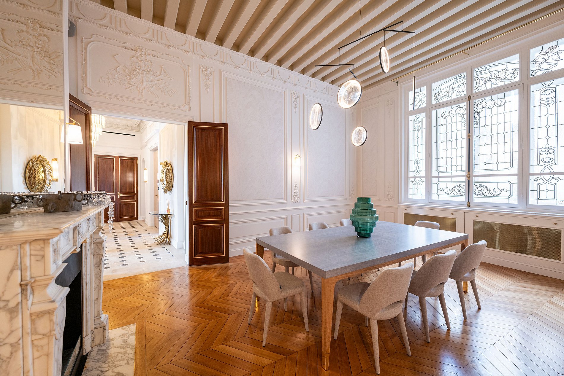 With a generous expanse of 320 square meters, this remarkable apartment commands a prime position next to the Ministry of Interior, with its balcony overlooking the iconic Elysée Palace and the prestigious Place Beauvau, while offering a captivating vista of the Grand Palais bathed in sunlight.